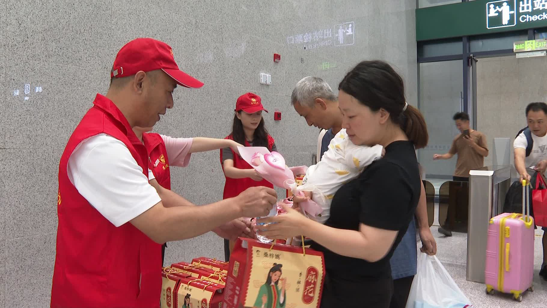 蓬安西站给首批到站旅客赠送土特产(摄影 杜红玉)
