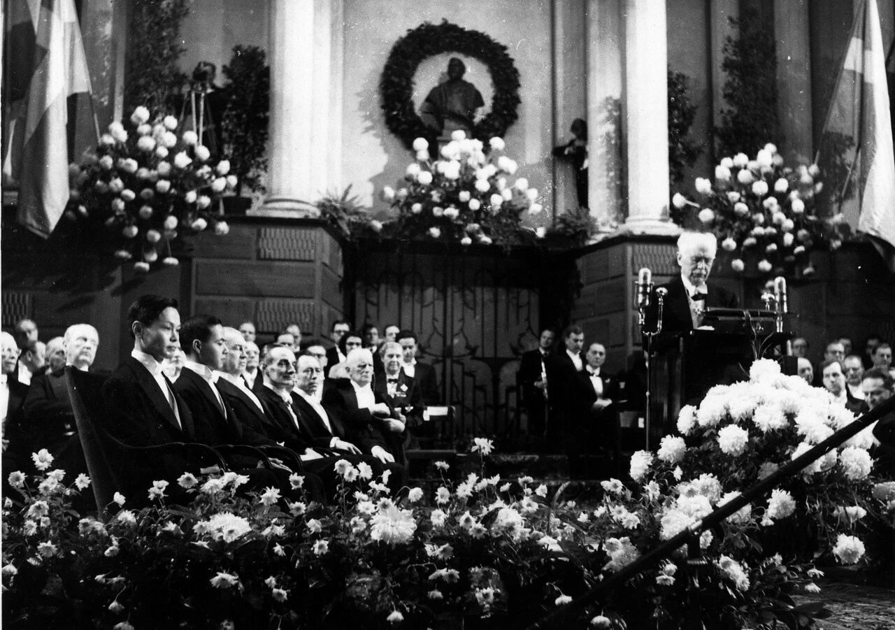 1957年诺贝尔奖颁奖现场。左起第一为杨振宁,第二为李政道。资料图