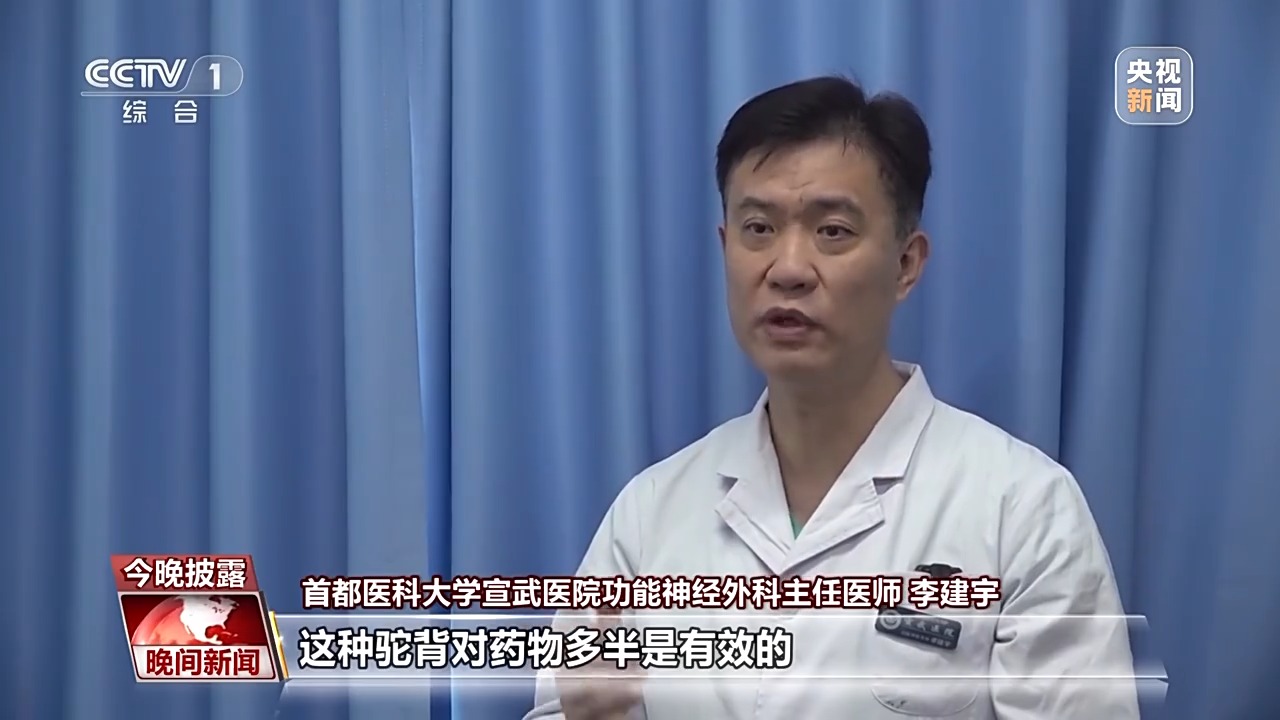 首都医科大学宣武医院功能神经外科主任医师 李建宇:如果您得了帕金森病,这种驼背对药物多半是有效的,在您吃完药好的时候,您的身子是可以直起来的。