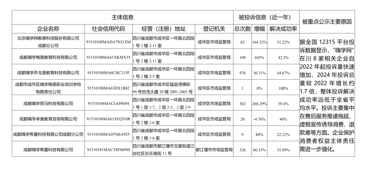 12月2日,省市场监管局对2025年度消费投诉信息重点公示经营者——嗨学网在川相关企业,开展集中行政约谈。成都市及相关区市场监管局、省消委会派员参加。