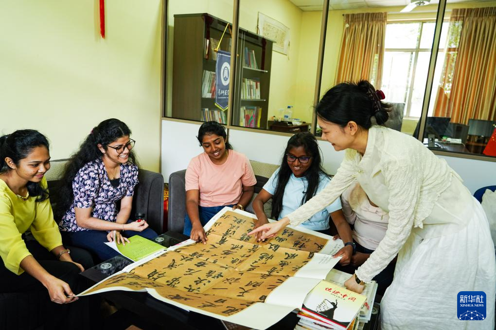 9月4日,在位于斯里兰卡中央山脉南麓的萨伯勒格穆沃大学,中国教师夏子涵(右)正在为孔子课堂汉语专业的学生们展示中国书法作品。新华社记者 陈冬书 摄