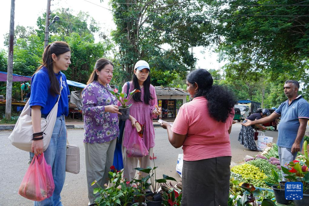 9月4日,斯里兰卡萨伯勒格穆沃大学孔子课堂院长朱颂(左二)、教师夏子涵(左三)和张欢(左一)在学校附近每周一次的传统集市上采购。新华社记者 陈冬书 摄