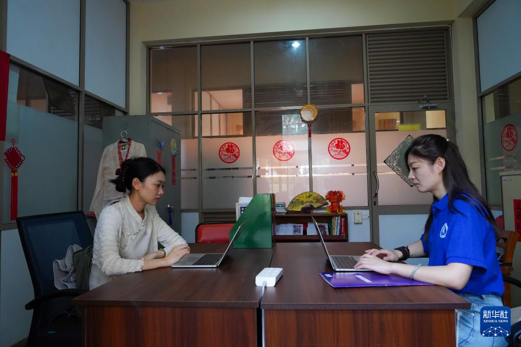 9月4日,在位于斯里兰卡中央山脉南麓的萨伯勒格穆沃大学,萨伯勒格穆沃大学孔子课堂的教师张欢(右)和夏子涵(左)在办公室里备课。新华社记者 陈冬书 摄