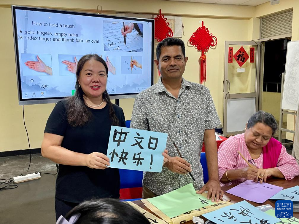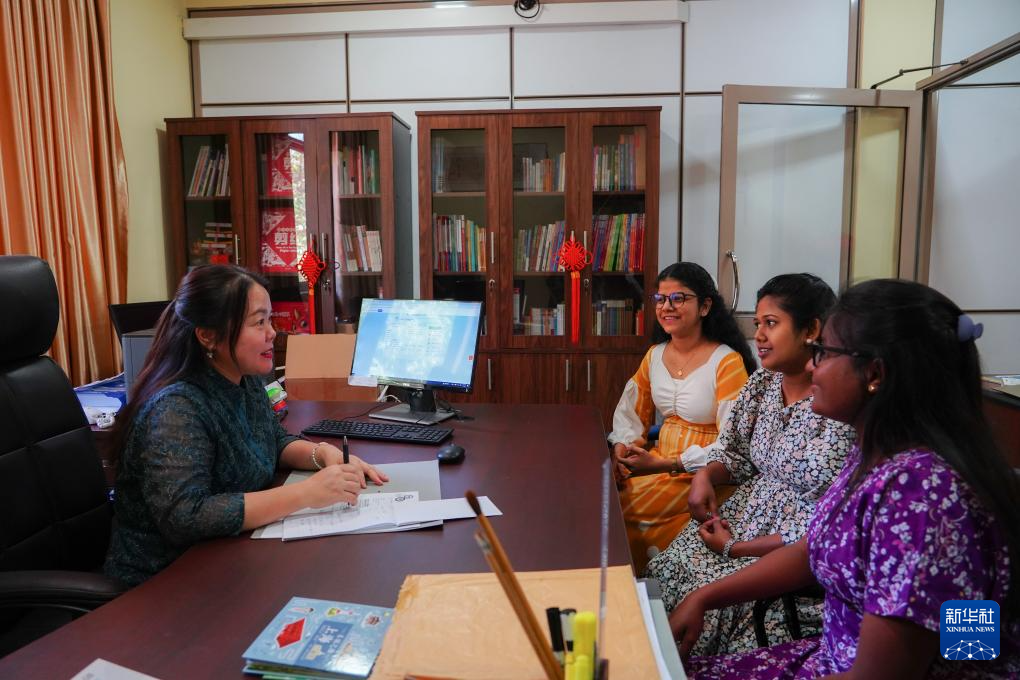 4月3日,在位于斯里兰卡中央山脉南麓的萨伯勒格穆沃大学,萨伯勒格穆沃大学孔子课堂院长朱颂(左)在“国际中文日”活动上与学校教职工汉语培训班的学员互动。新华社发(萨伯勒格穆沃大学孔子课堂供图)