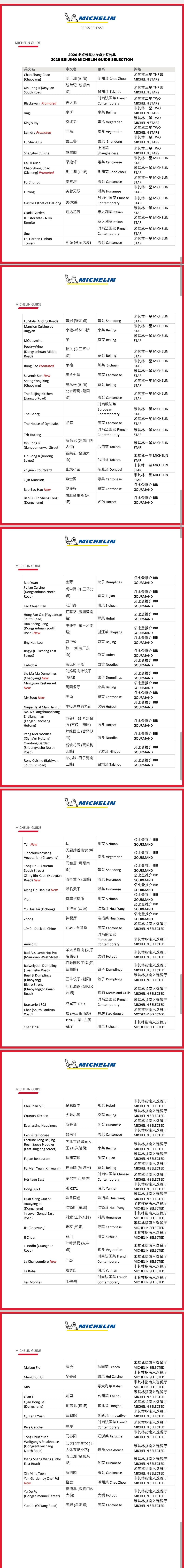 10月29日,米其林指南正式公布2026北京米其林指南完整榜单及4项个人大奖。共计99家餐厅入选新版北京米其林指南,其中包括:2家米其林三星餐厅、6家米其林二星餐厅(包括2家新晋餐厅)、24家米其林一星餐厅(包括1家新上榜餐厅,2家新晋餐厅)、26家必比登推介餐厅(8家新上榜餐厅)、41家米其林指南入选餐厅(2家新上榜餐厅)、一家绿星餐厅及4项特别奖项:米其林指南导师厨师奖、年轻厨师奖、侍酒师奖和服务奖。其中米其林指南导师厨师奖首次在中国内地颁出。至此米其林指南在中国内地的奖项扩大到十项。