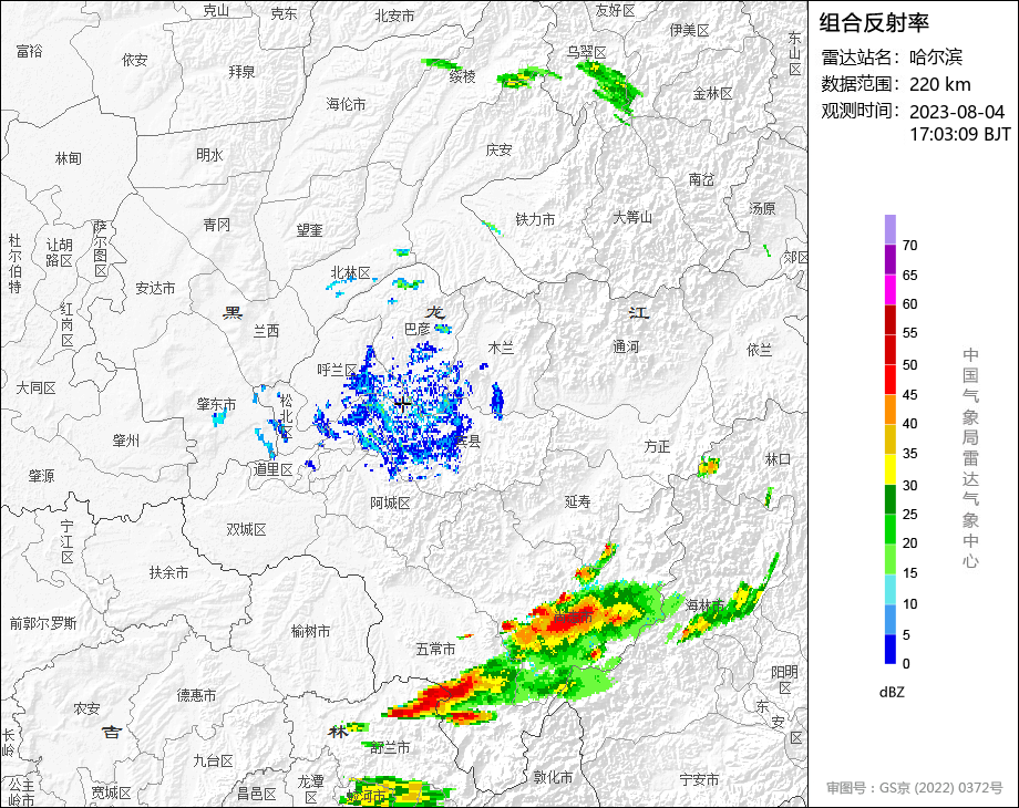 8月4日17时3分哈尔滨单站天气雷达图 (央广网发 来源:中央气象台网站)