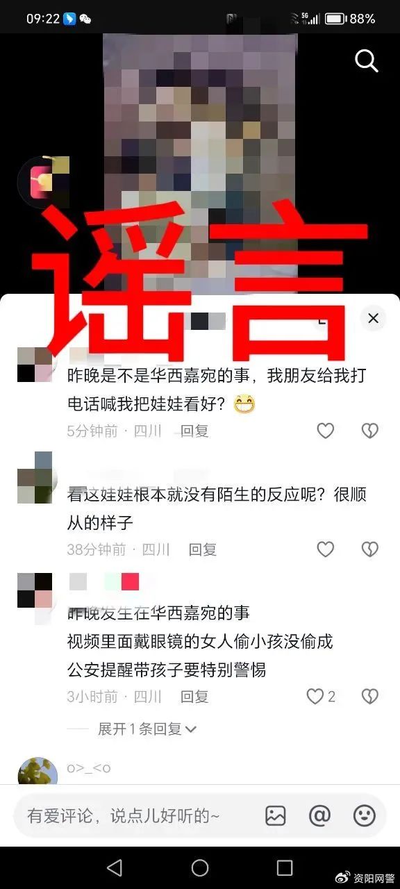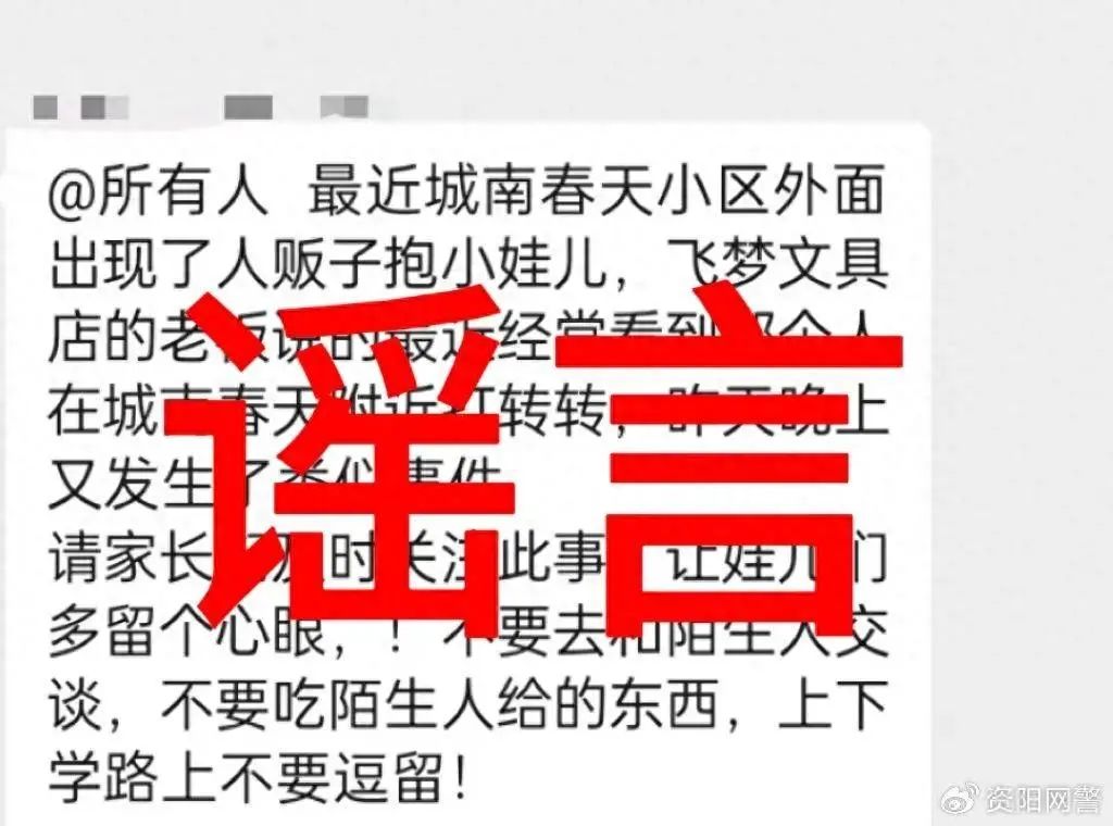 近日,资阳市高新区一网民在微信群发布“有人贩子抱小娃儿”的内容,引发网民关注。经民警核实,辖区未发生此类案件,该消息为不实信息。