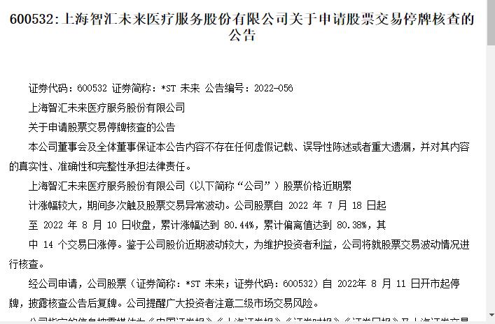 8月10日晚,*ST未来公告称,公司股票价格近期累计涨幅较大,期间多次触及股票交易异常波动。鉴于公司股价近期波动较大,为维护投资者利益,公司将就股票交易波动情况进行核查。经公司申请,公司股票自2022年8月11日开市起停牌。
