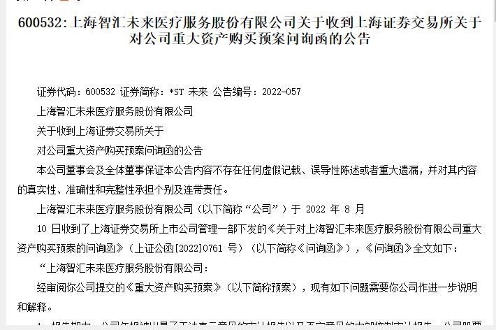 同日晚间,上交所对*ST未来下发关于重大资产购买预案的问询函,要求*ST未来补充说明标的资产的预估交易价格确定的依据与合理性以及本次收购决策是否审慎合理,是否存在迎合热点炒作股价的情形等。