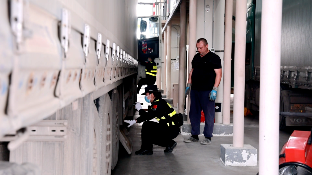 民警对入境货车进行查验 (格日乐图 摄)