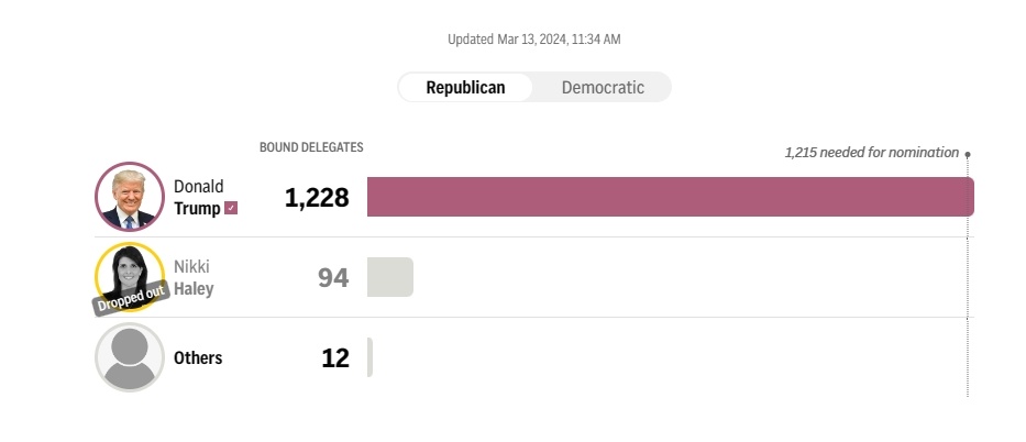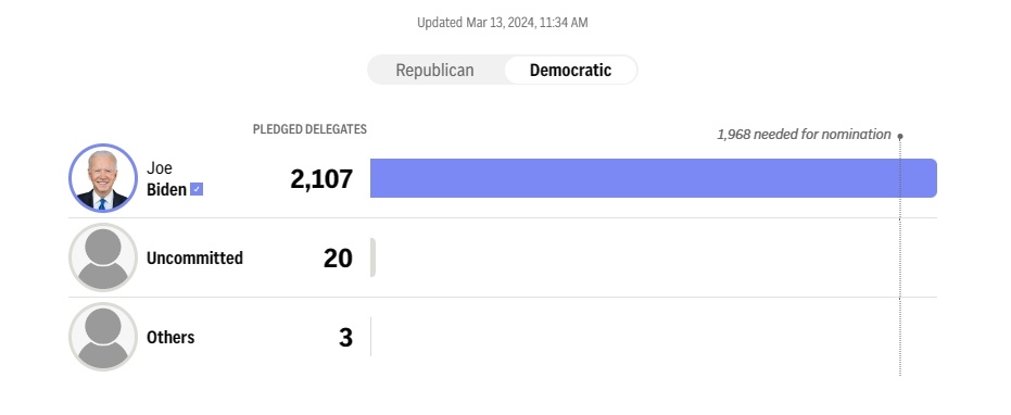 据悉,拜登需要在美国各州3934名民主党代表中获得至少1968名代表的支持才能最终获得民主党总统候选人的提名,特朗普则需在各州2429名共和党代表中获得至少1215名代表的支持。据美联社截至美国东部时间12日23时30分左右的统计数据,拜登和特朗普已分别获得各自党内2107名和1228名代表的支持。