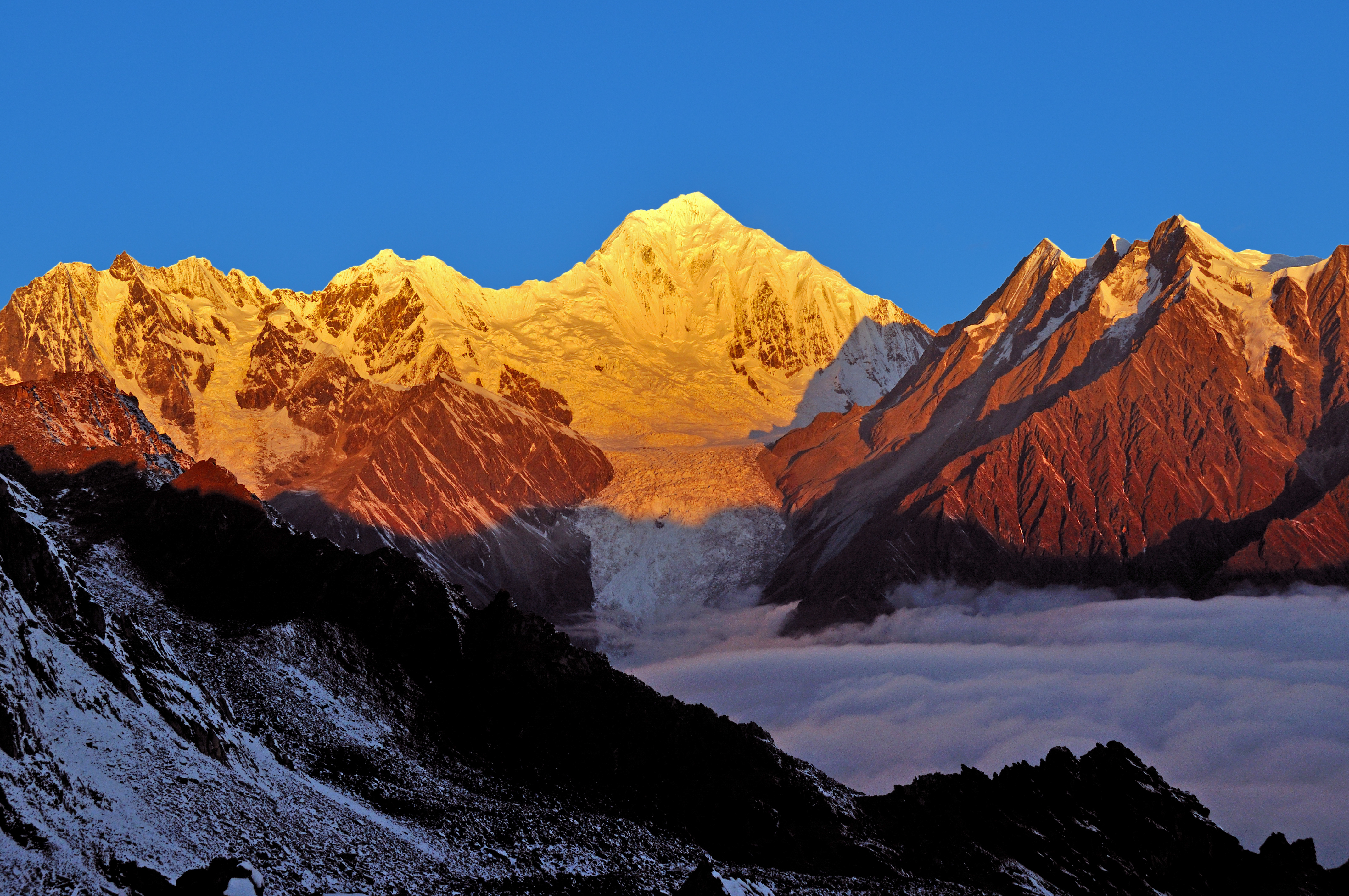 “一沟有四季,十里不同天”,五月的海螺沟变化万千,贡嘎雪山脚下的磨西古镇阳光热烈,行至山顶偶尔能遇到大雪纷纷,巍峨的贡嘎雪山矗立在漫漫云海中,场面十分壮观。