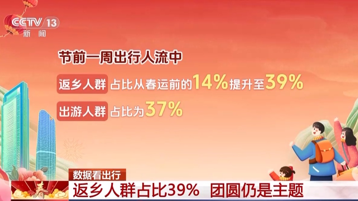 中国移动梧桐大数据分析发现,节前一周,返乡人群占比从春运前的14%大幅跃升至39%,出游人群占比达37%,可见返乡团圆仍是主旋律。