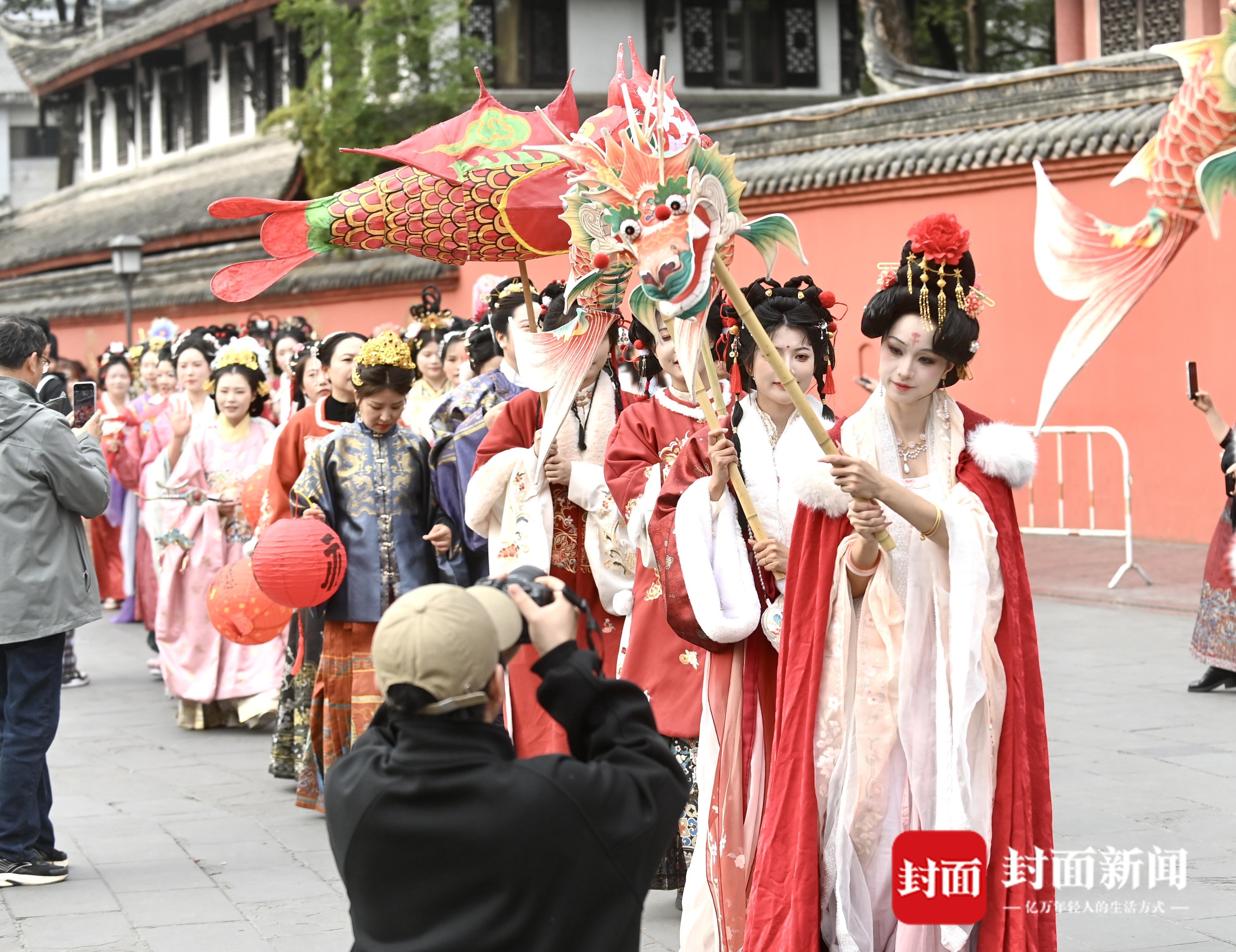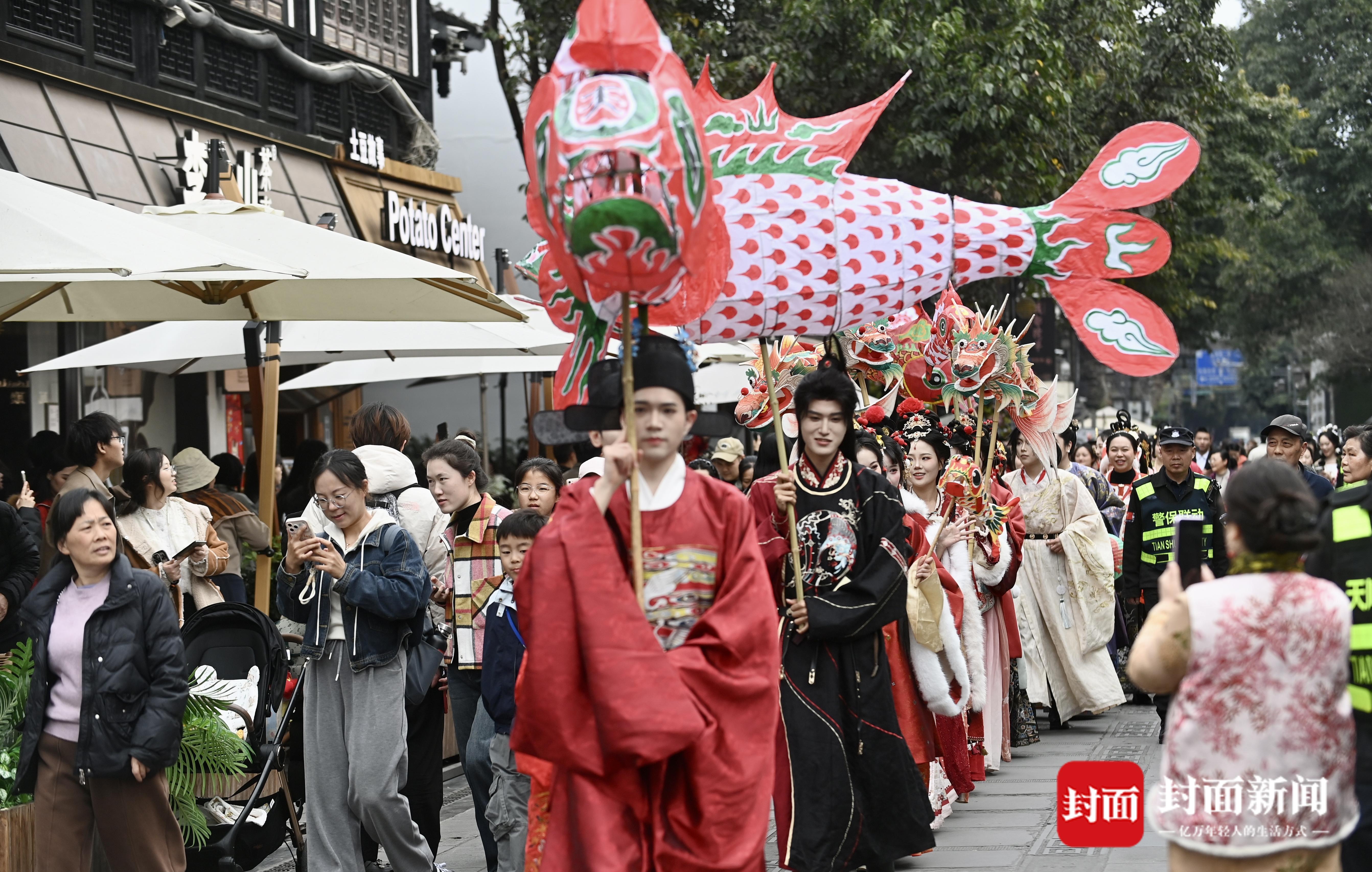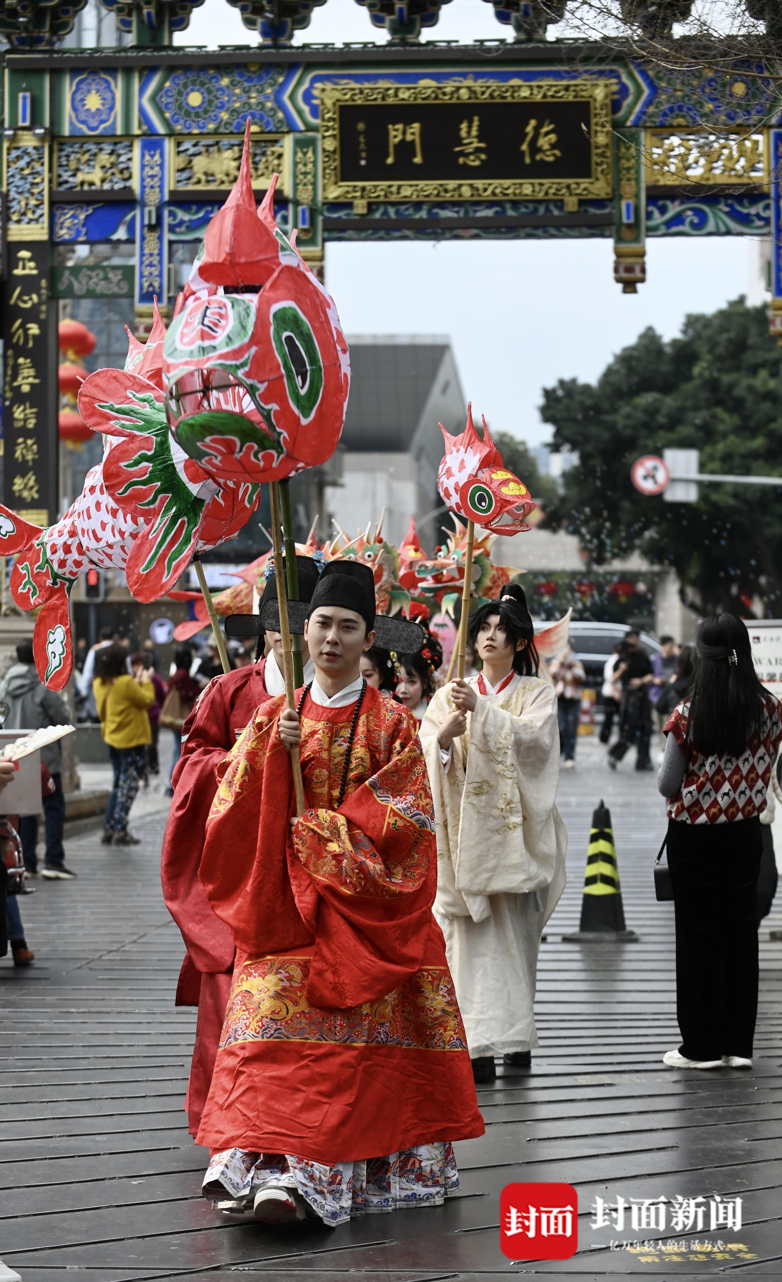 成都文殊坊街区花灯巡游闹元宵。