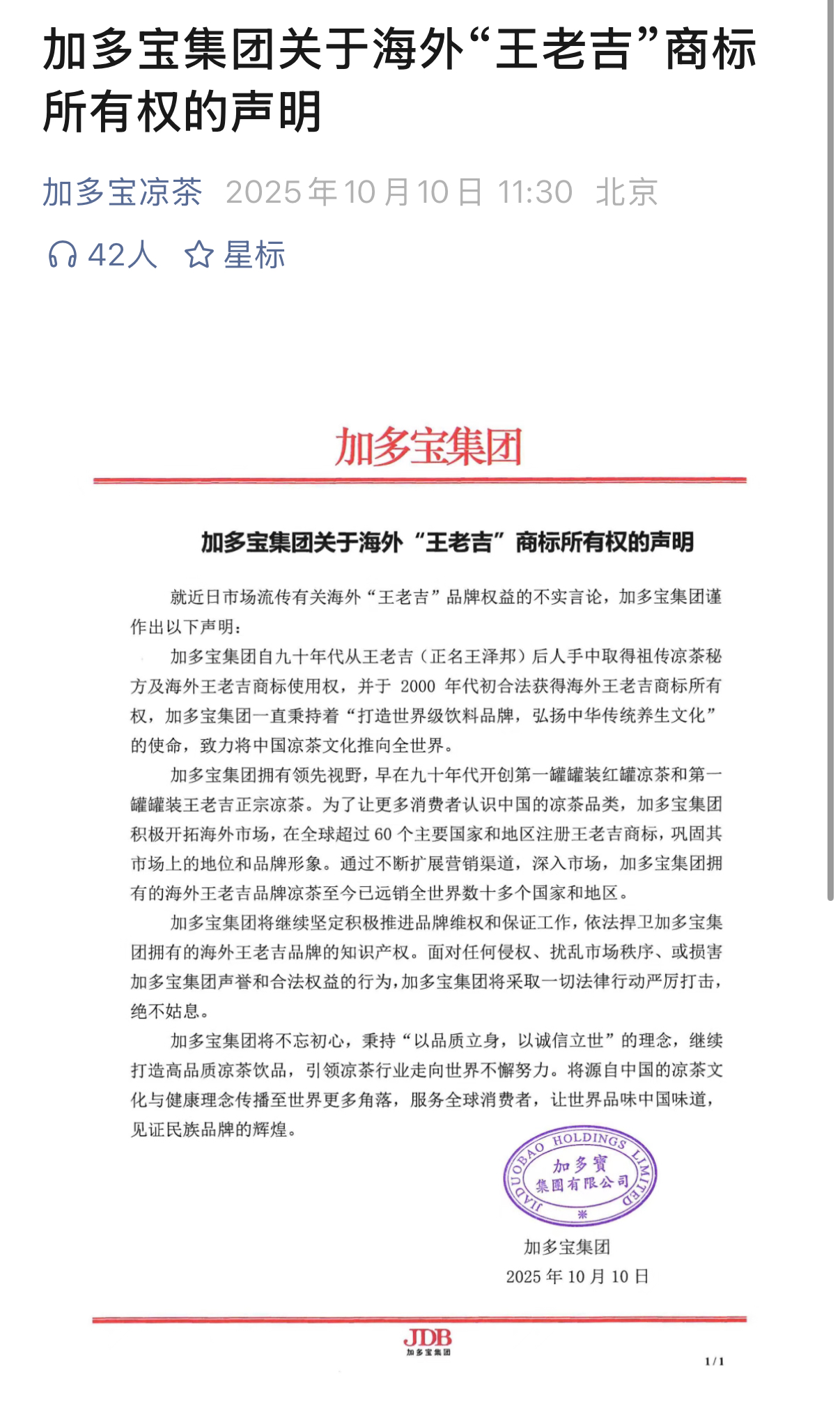 在这份第二声明中,王老吉以 “有病去医院,有事找法院。谢谢!” 的简短表述亮明立场,言辞间透露出通过法律途径解决争议的强硬态度。而早在 9月30日的首份声明中,王老吉已明确驳斥加多宝相关说法 “严重背离事实、蓄意误导公众”,直指加多宝通过海外离岸关联公司万捷有限公司实施 “恶意注册”,对自身品牌声誉与合法权益造成损害。