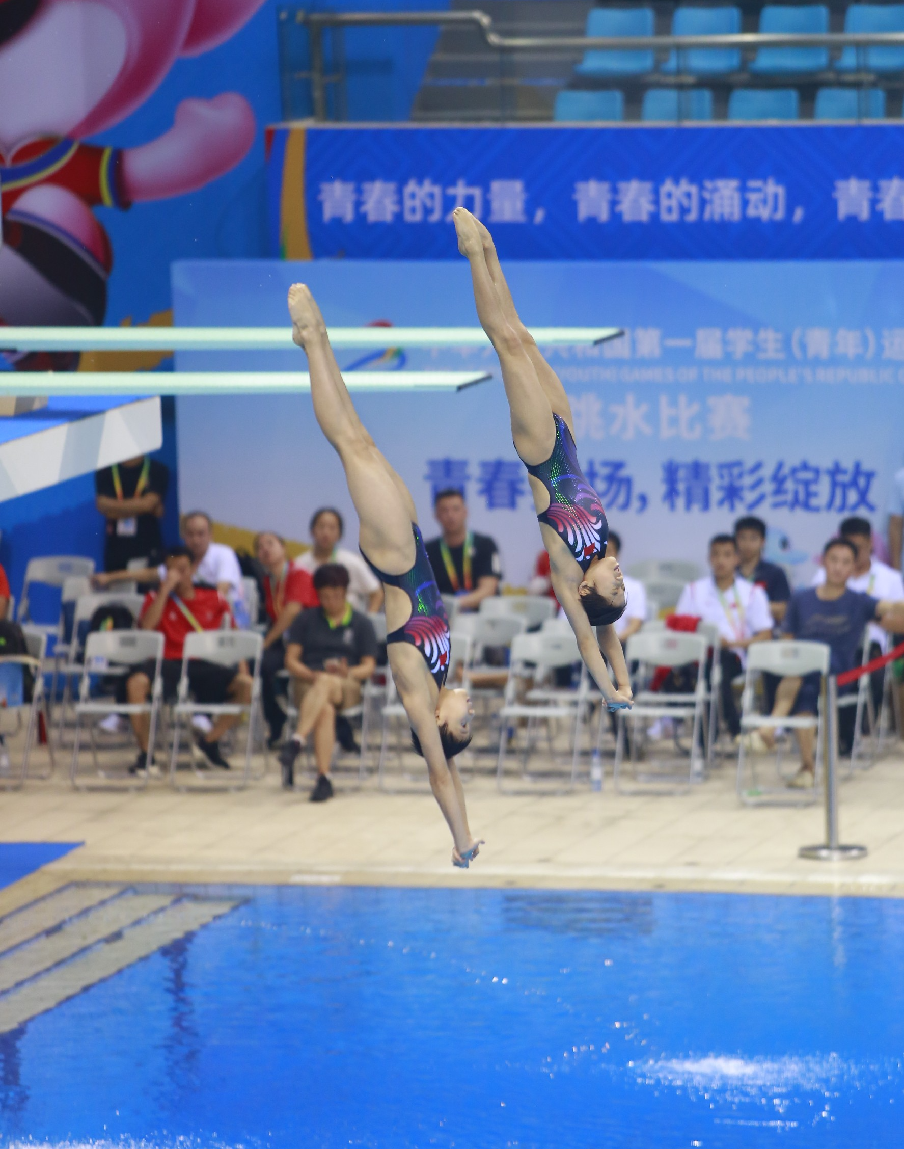 南宁队门泓秀/吴凡贝在女子双人十米跳台比赛中。图片由主办方提供