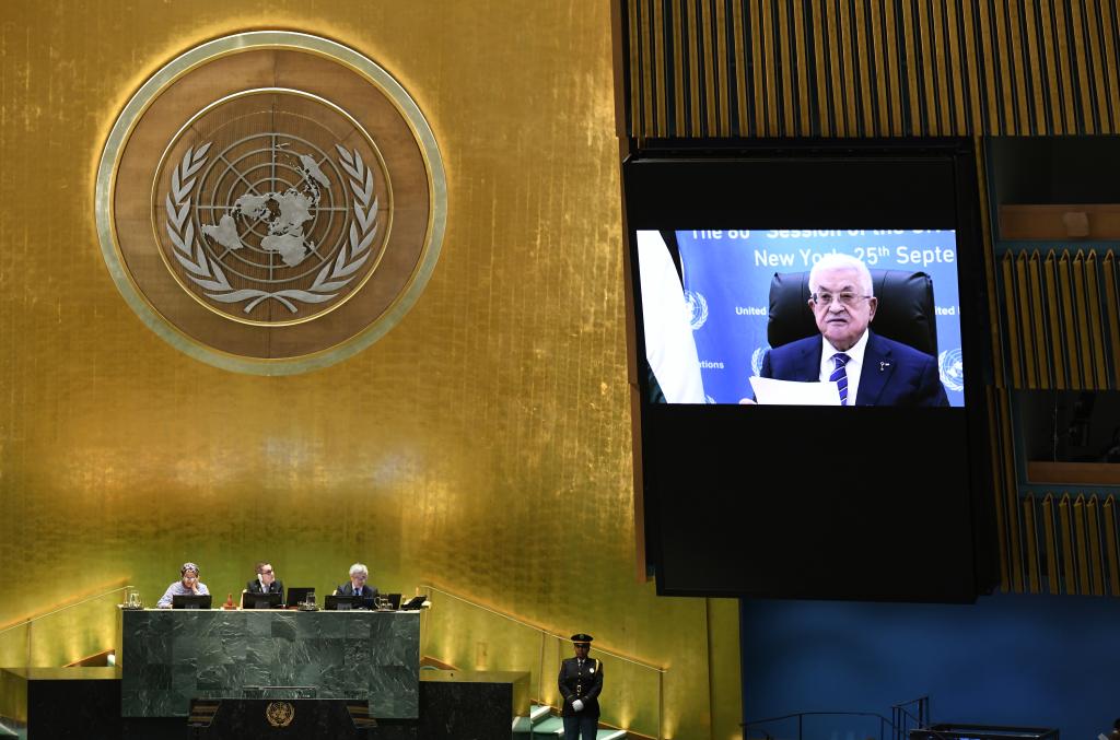 9月25日,在位于纽约的联合国总部,巴勒斯坦总统阿巴斯以视频连线方式在联合国大会一般性辩论上发言。新华社记者李睿摄