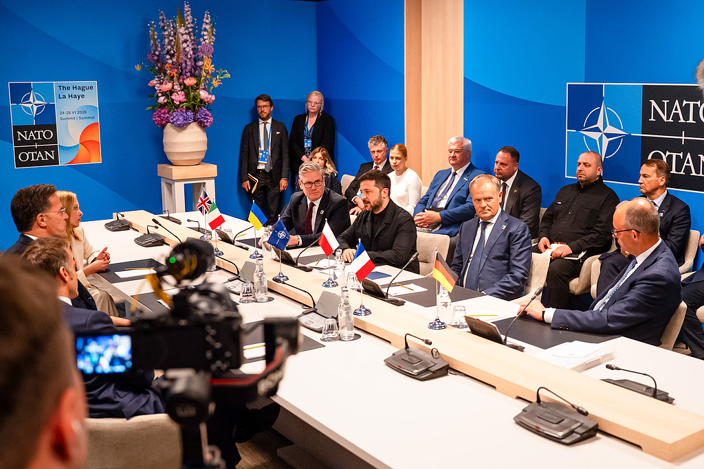 △当地时间2025年6月24日,在荷兰海牙举行的北约峰会期间,乌克兰总统泽连斯基出席了有法国总统马克龙、北约秘书长吕特、意大利总理梅洛尼、英国首相斯塔默、波兰总理图斯克和德国总理默茨参与的会议。(图自视觉中国)