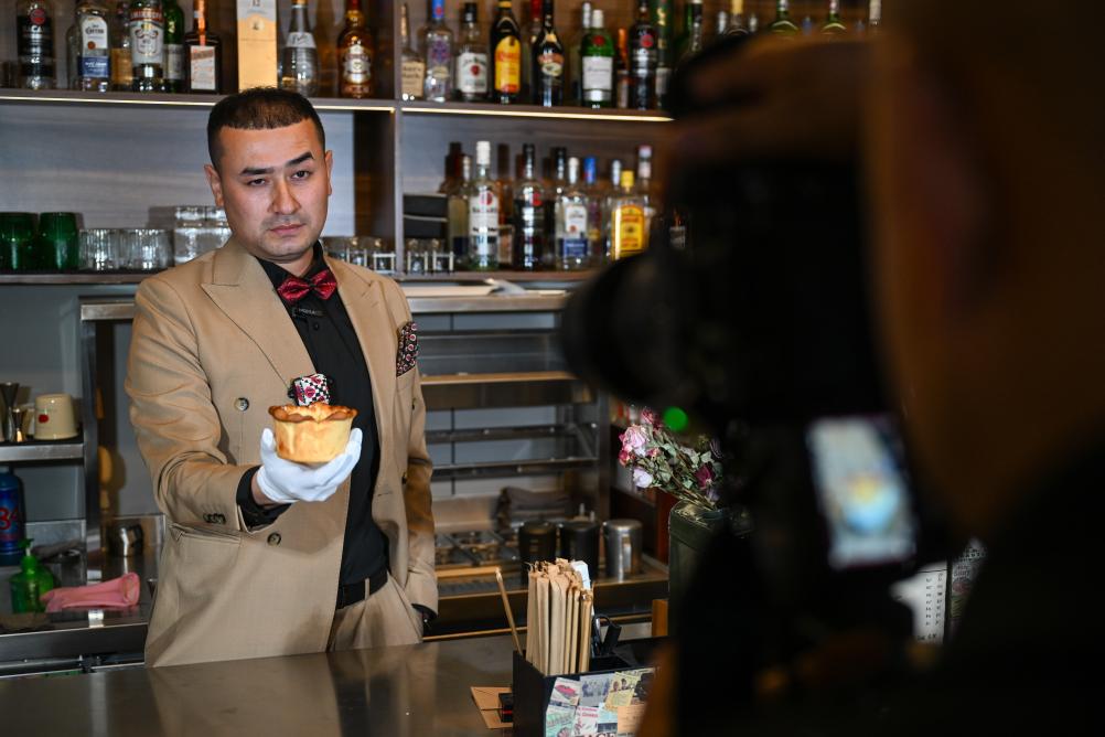 新华社乌鲁木齐3月14日电(记者苟立锋 丁磊)见到依木拉·亚尔买买提时,他正和团队在一家咖啡店里拍摄新疆特色饮品——馕咖啡。身着一身西装礼服、手戴白手套,只见他在各种镜头前往杯子形状的馕里加入滚烫的牛奶、咖啡,一杯新疆版的“馕布奇诺”热乎上桌。