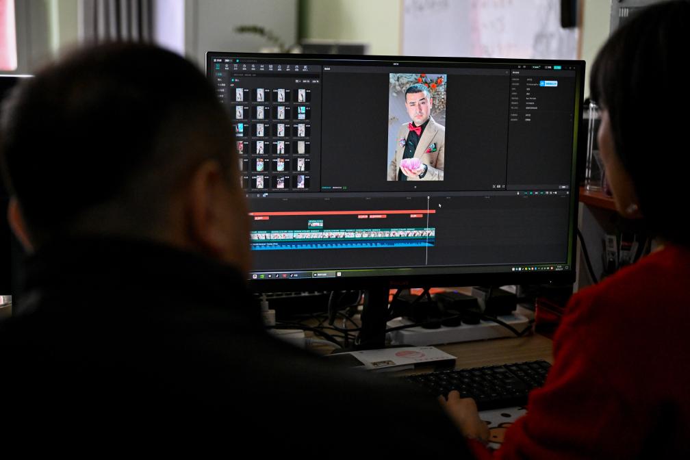 在新疆伊犁哈萨克自治州察布查尔锡伯自治县,依木拉·亚尔买买提(左)和编导在工作室编辑短视频(3月11日摄)。新华社记者 丁磊 摄