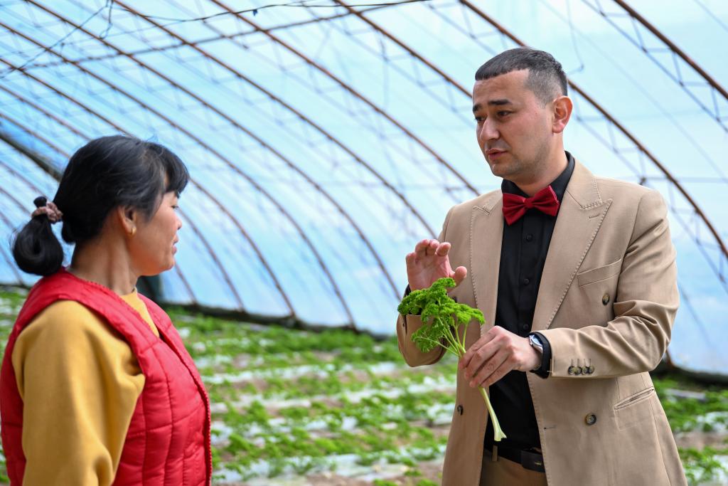 在新疆伊犁哈萨克自治州察布查尔锡伯自治县科技示范基地,依木拉·亚尔买买提(右)和农户交流(3月7日摄)。新华社记者 丁磊 摄