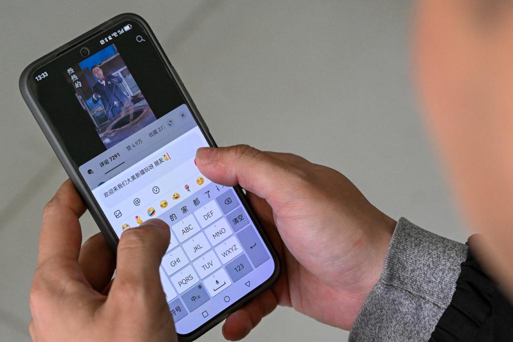 在新疆伊犁哈萨克自治州察布查尔锡伯自治县,依木拉·亚尔买买提在回复网友留言(3月11日摄)。新华社记者 丁磊 摄