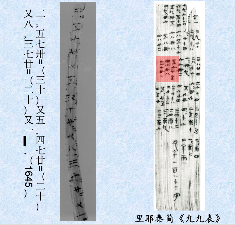 左为秦家咀墓地战国楚简《九九术》,右为里耶秦简《九九表》