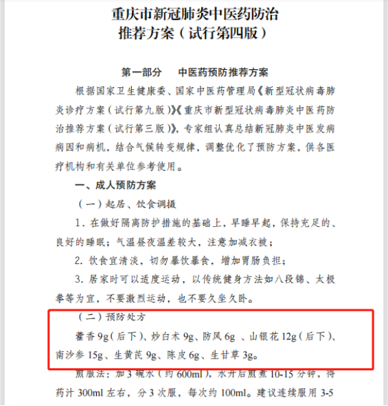 为充分发挥中医药在新型冠状病毒肺炎预防、治疗、康复中的作用,结合冬季时令变化和新冠肺炎疫情防治实践,11月17日,重庆市卫健委组织专家修订并发布了《重庆市新冠肺炎中医药防治推荐方案(试行第四版)》,详细介绍了中医药针对新冠肺炎的相关预防方案。针对不同人群人体生理病理特点,结合重庆本轮疫情,按照中医理论,专家组在方案中还分别开出了针对普通成人及儿童的两张防疫“经方”,引起广大市民关注,主动寻求购买。