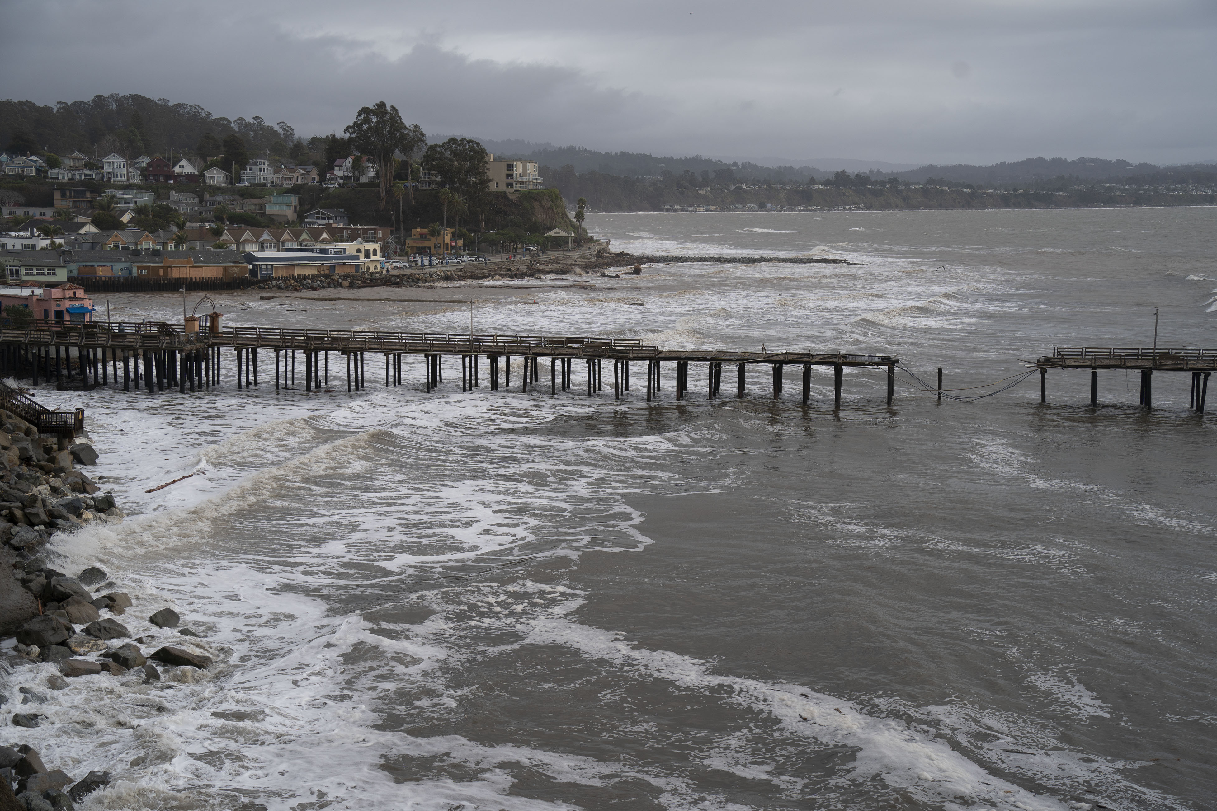 这是1月10日在美国加利福尼亚州圣克鲁斯县卡皮托拉拍摄的在风暴中损毁的海边栈桥。新华社发(李建国摄)