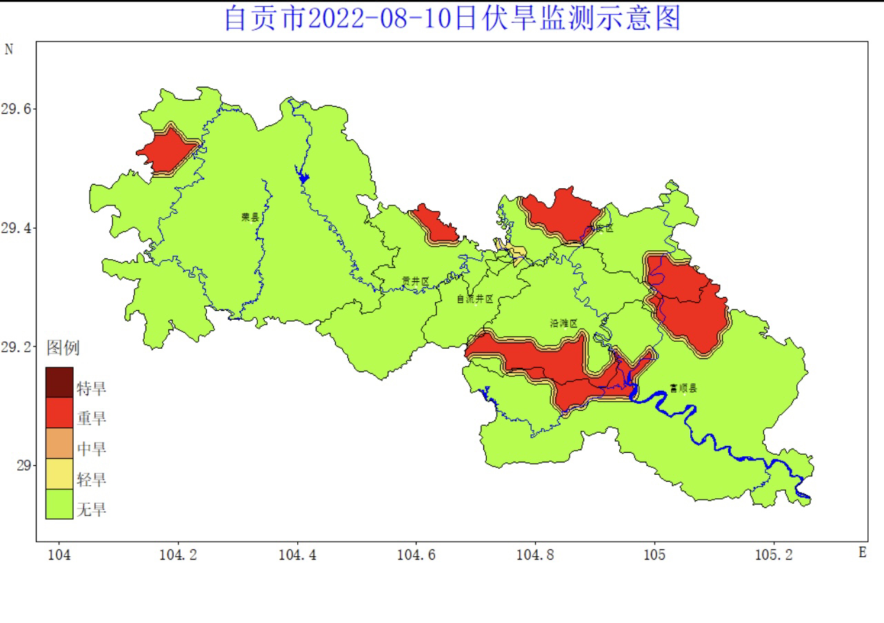 经过8月2到5日的降雨过程,自贡市绝大部分地方的气象干旱得到解除,但还有个别地方的旱情在持续,并达到了重旱程度。旱区主要分布在荣县西部、贡井区北部、大安区北部、沿滩区西南部、大安区东南部和富顺县东北部的个别地方。