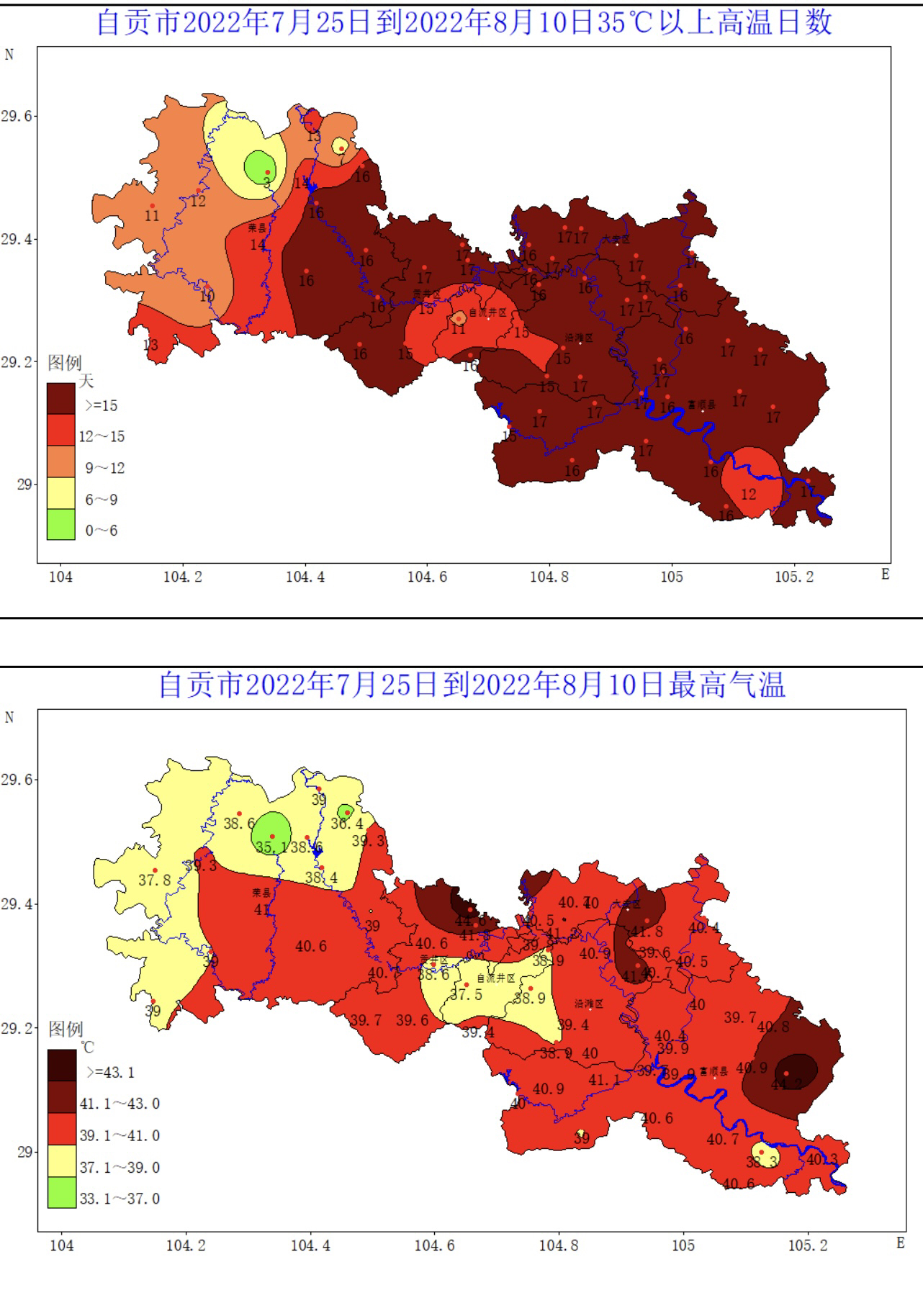 自贡市气象台 [2022]年第10期《自贡市2022年高温伏旱监测报告(08)》显示,7月份以来,自贡市高温天气频繁出现,7月上中旬出现了今年第一轮12天的持续异常高温天气;从7月25日开始,全市又开启了今年第二轮高温热浪天气,截至8月10日,此轮高温天气已持续16到17天,荣县、市区、富顺县国家气象站日最高气温达到38.6、39.8、39.9℃,平均气温达到30.6、31.8、31.6℃,创历史同期新高。目前,高温天气仍在发展加强。
