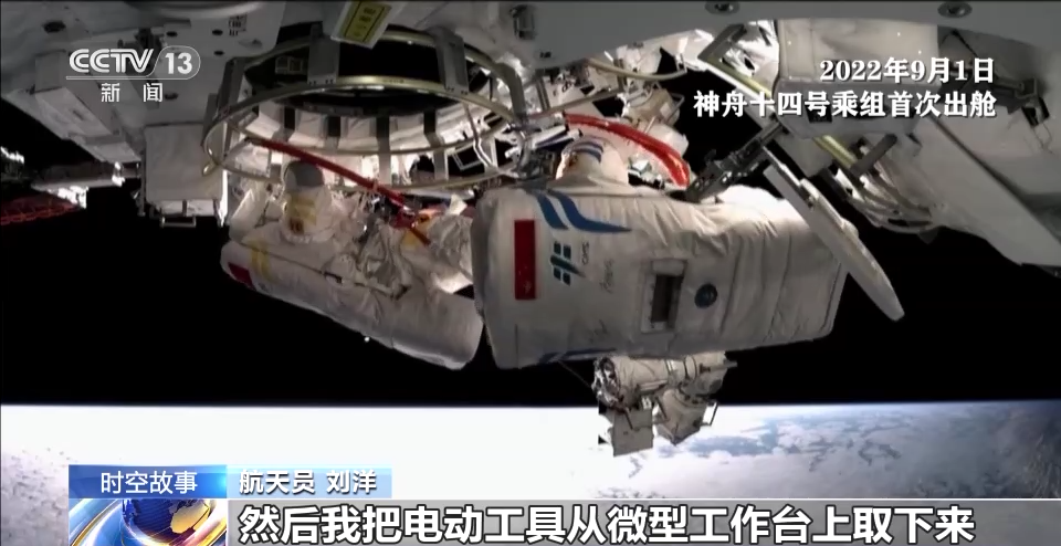 航天员 刘洋:登上小臂之后,然后小臂运动带着我来到了全景相机操作点,然后我把电动工具从微型工作台上取下来,卸掉了、拧松了4个松不脱螺丝,然后把全景相机抬升起来,再把我的电动工具放回到我的微型工作台上。我觉得那一刻还是挺帅气的,拿着那么长的电动工具。当时在小臂上运动的时候还是挺轻松的,就像坐车的感觉一样。