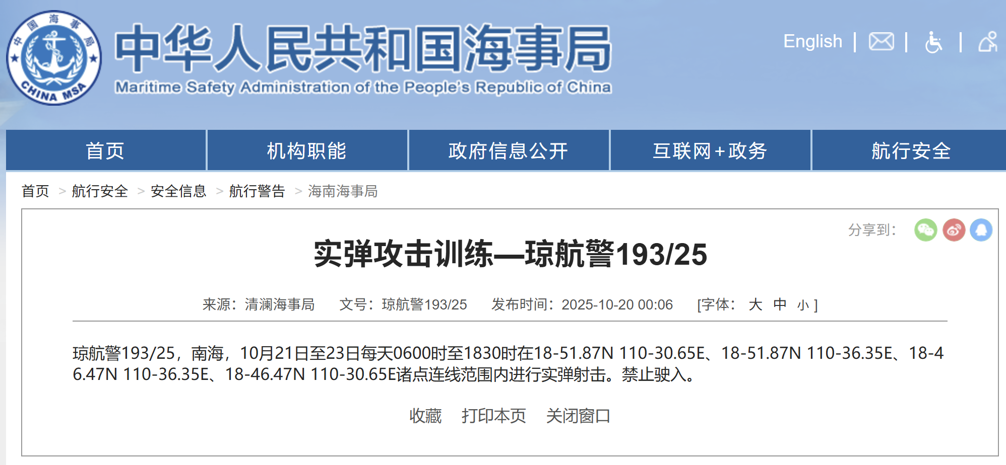 航行警告!南海实弹射击训练 人民日报客户端 2025-10-21 07:24 13936 据中国海事局网站消息,清澜海事局发布航行警告,10月21日至23日每天6点至18点30分,南海部分海域进行实弹射击,禁止驶入。 评论 0 还没有添加任何评论,快去APP中抢沙发吧! 我要评论