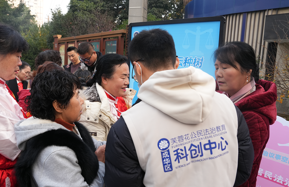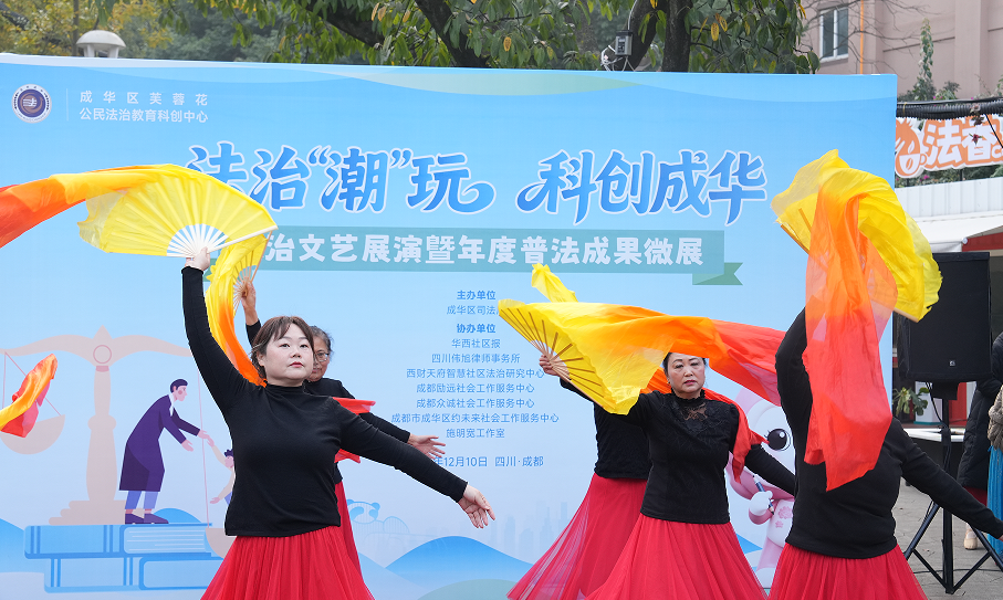 12月10日上午,成都市成华区芙蓉花公民法治教育科创中心内欢声笑语、舞姿翩跹,一场以“法治‘潮’玩 科创成华”为主题的法治文艺展演暨年度普法成果微展活动在此举行。活动发布了成华区司法局创新打造的“法治芙蓉云种树”交互系统,集中展示成华年度普法成果,并通过精彩的法治文艺演出,让市民感受法治的力量与温度。