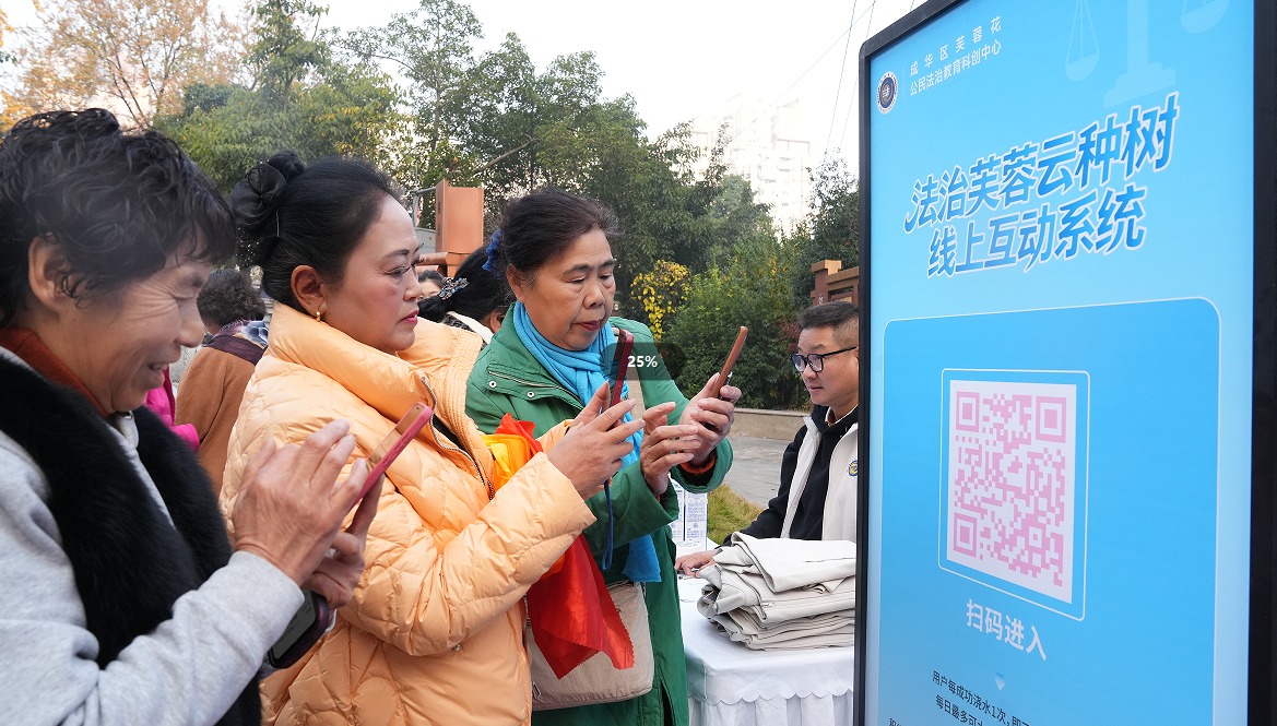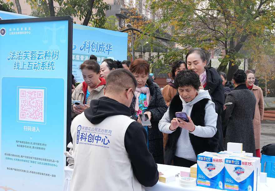 活动现场,由成华区司法局创新打造的“法治芙蓉云种树”交互系统正式亮相。该系统将普法学习设计成趣味盎然的互动游戏,用户通过微信扫码进入平台,每日可为“法治之树”浇水,每次浇水即可获得积分并随机学习一条实用法律知识。当积分累积至一定数额,便可在线下指定地点兑换文创礼品。