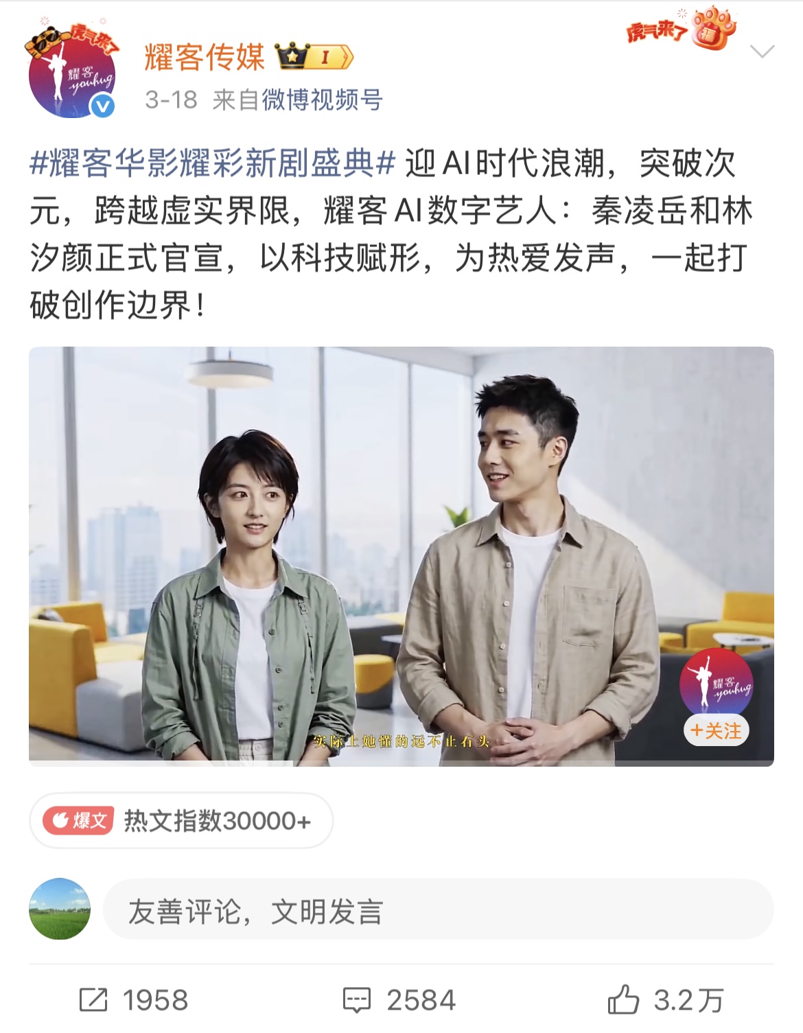 耀客传媒官宣签约两名AI数字艺人 耀客传媒微博截图