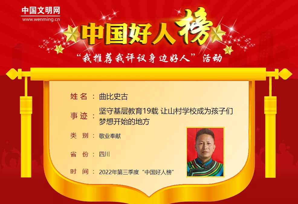 近日,2022年第三季度“中国好人榜”揭晓,曲比史古登上榜单。“让山村学校成为一个有梦想的地方”在曲比史古和其他老师的努力下,不断成为现实。