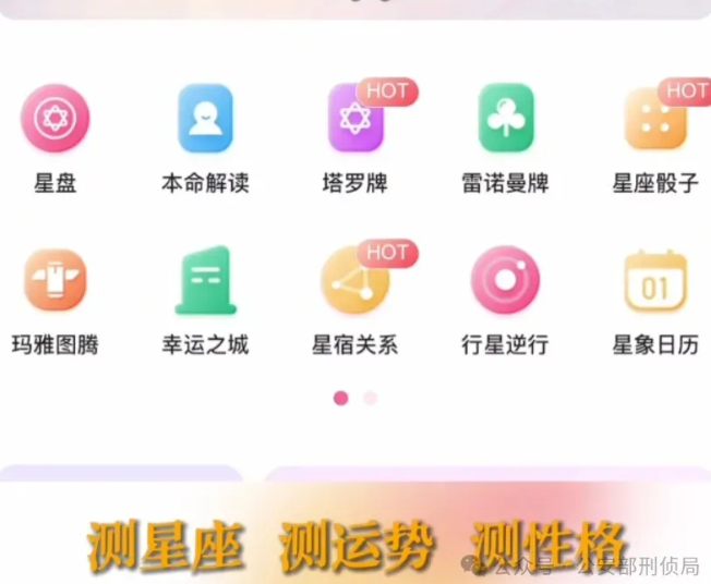 “测星座”“测性格”“测运势” 等各类测试,往往需要填写个人的姓名、手机号、身份证号,一旦填写以上个人信息,你的性格喜好、家庭条件等情况就会被骗子收集分析,从而量身定制诈骗方案,实施精准诈骗。