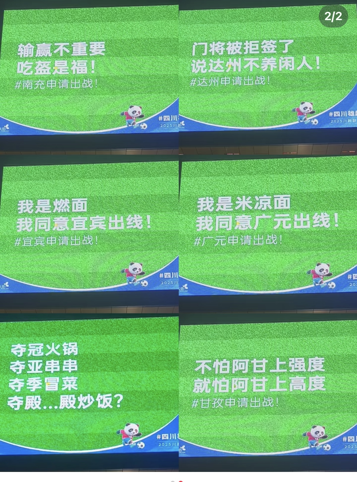 市民们期待在更多场合展现自家实力,将目光转向各个城市的商超大屏,一个个爆梗呼之欲出。“凉山好医生,专治各种不服”“我是米凉面,我同意广元出线”“输赢不重要,吃盔是福(南充)”“涪江浪打浪,遂宁强中强”……梗出圈了,城市也就出圈了。
