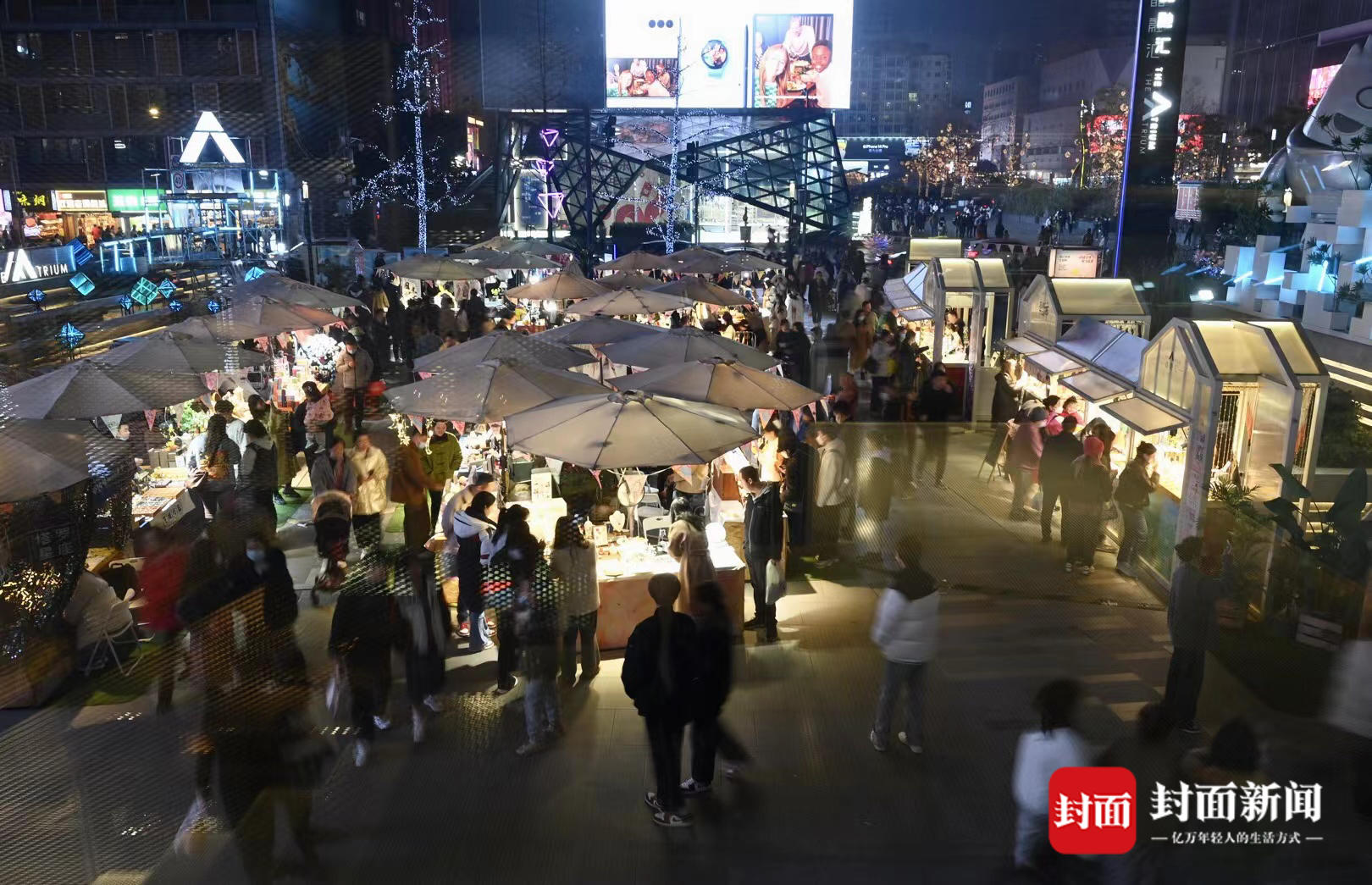 在成都,夜市不止三色路。暮色四合、华灯初上,围绕大学城而生的犀浦夜市,烧烤架上升腾起的烟火气抚慰忙碌一天的身体;万象城里,逛街的年轻人来到了正在展出的新春集市前,他们的目光被有趣的文创小物吸引。