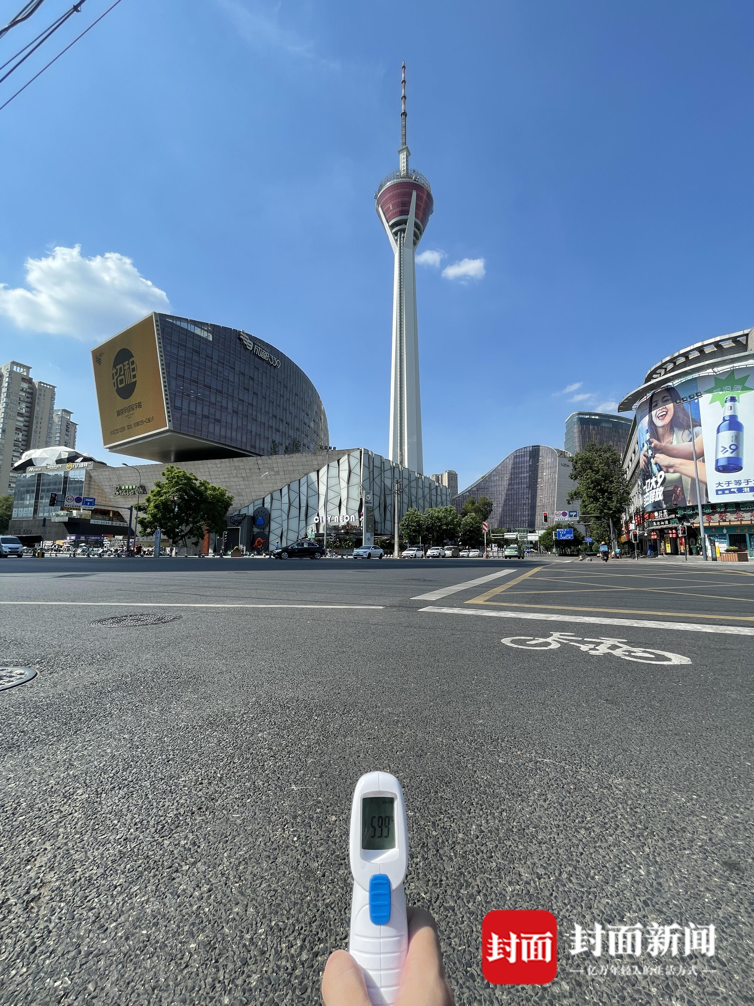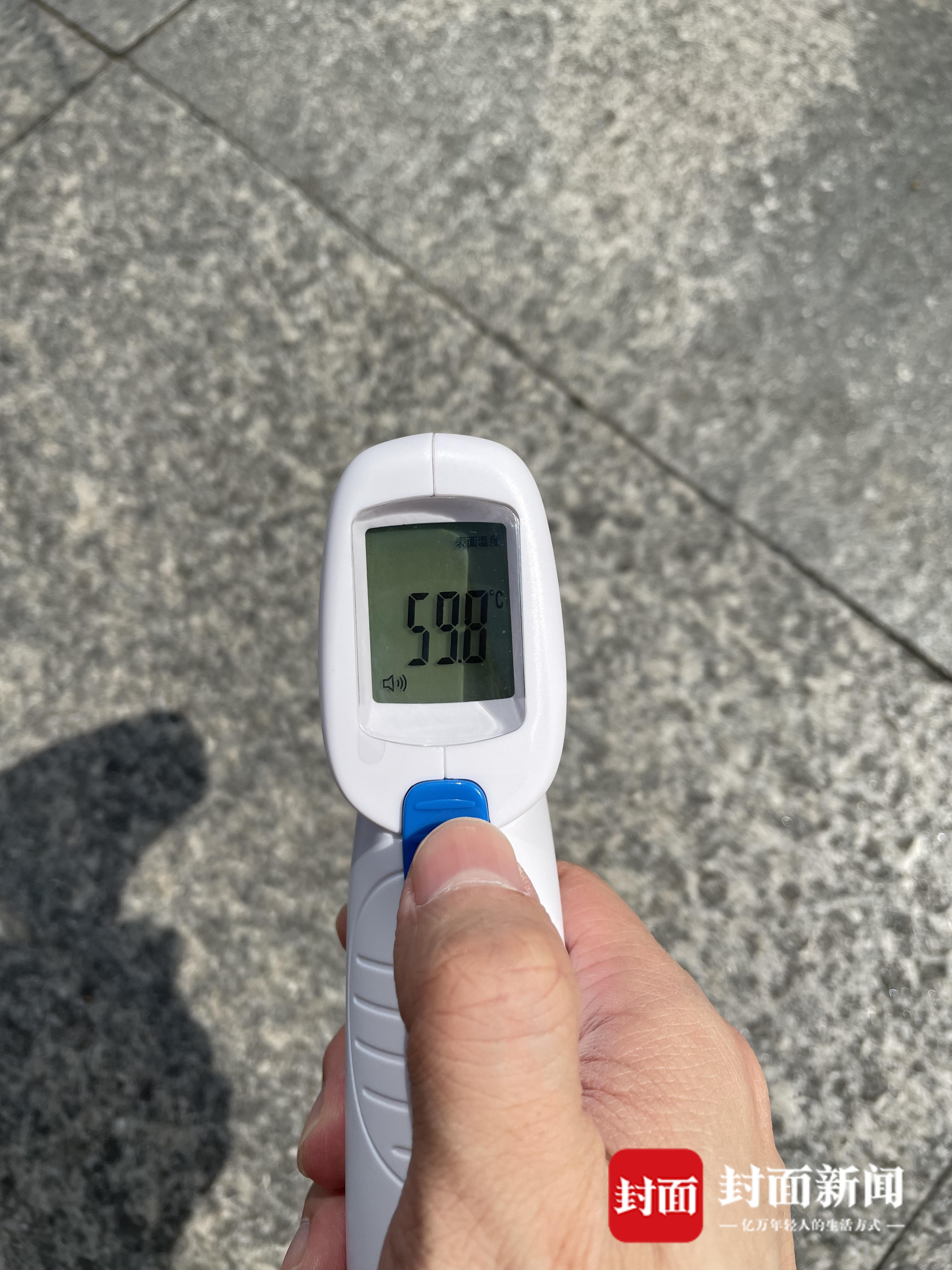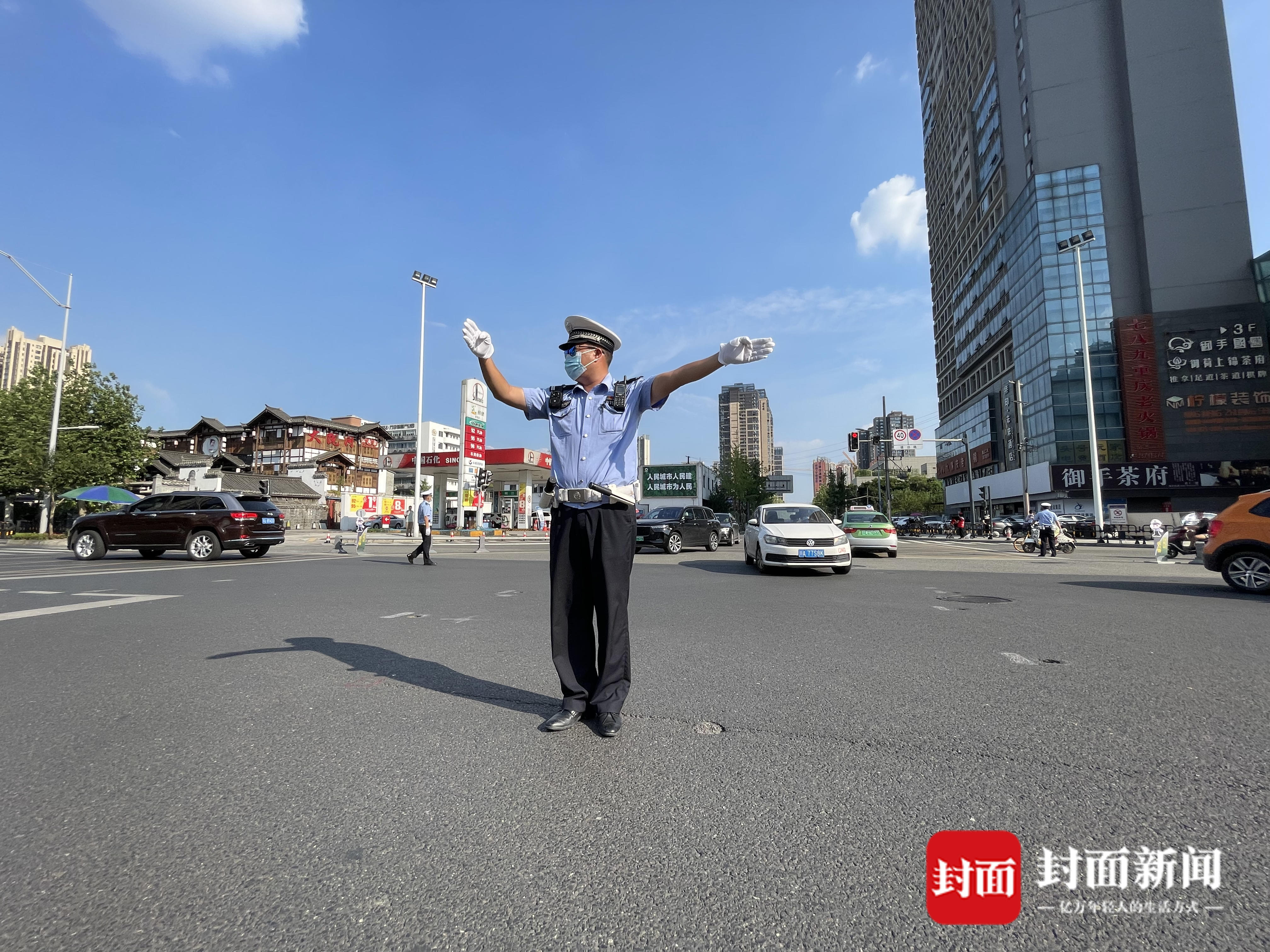 下午4点50分,气温37℃,记者用测温枪在地表测得温度近60℃。在成都市成华区建设北路建功路路口,成都交警五分局二大队警长尹显祥在路中间疏导交通。抬手、转身……来往的车辆在他的指挥下有序通过,他身上的衣服被汗水打湿,很快又被烈日烤干。