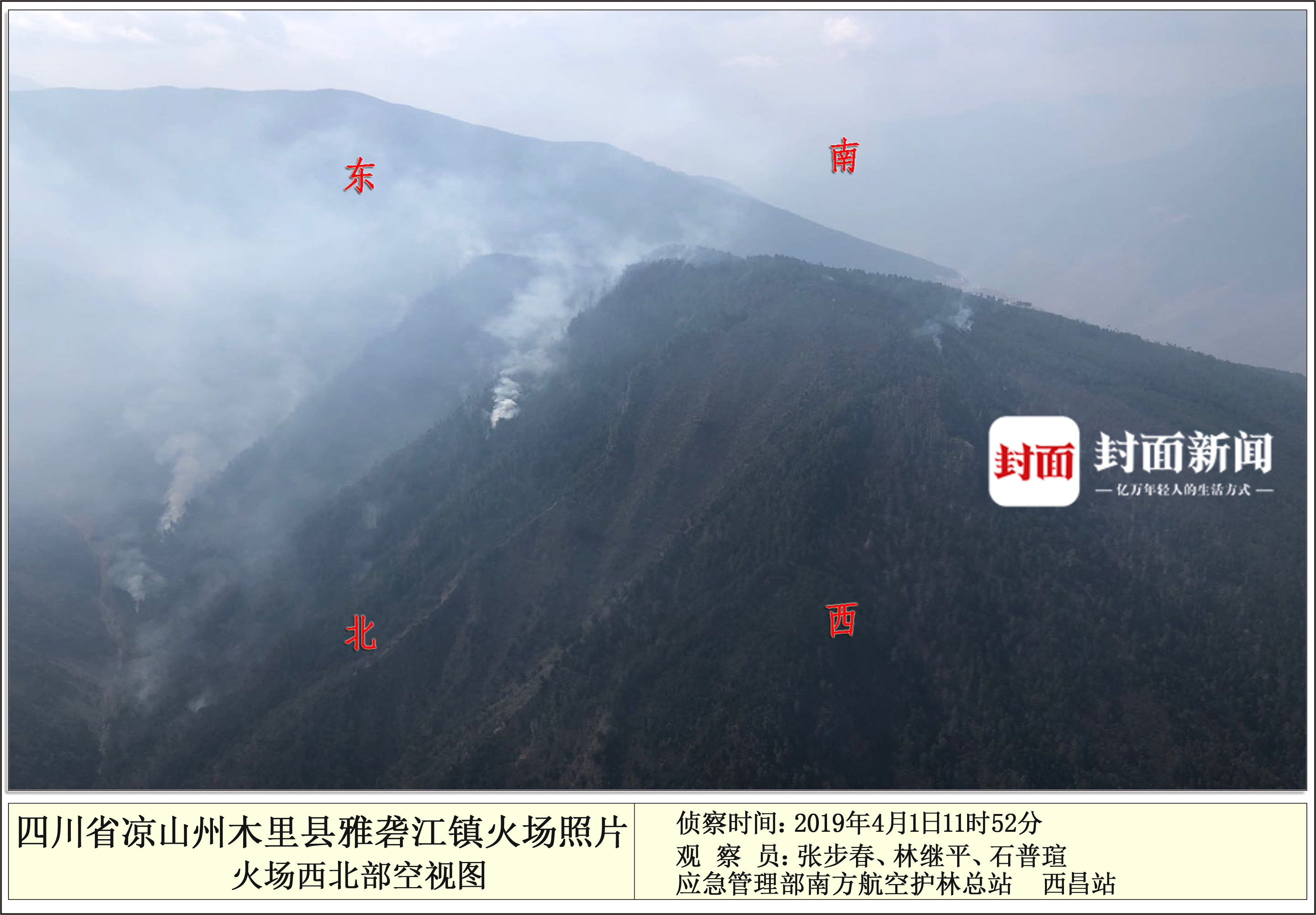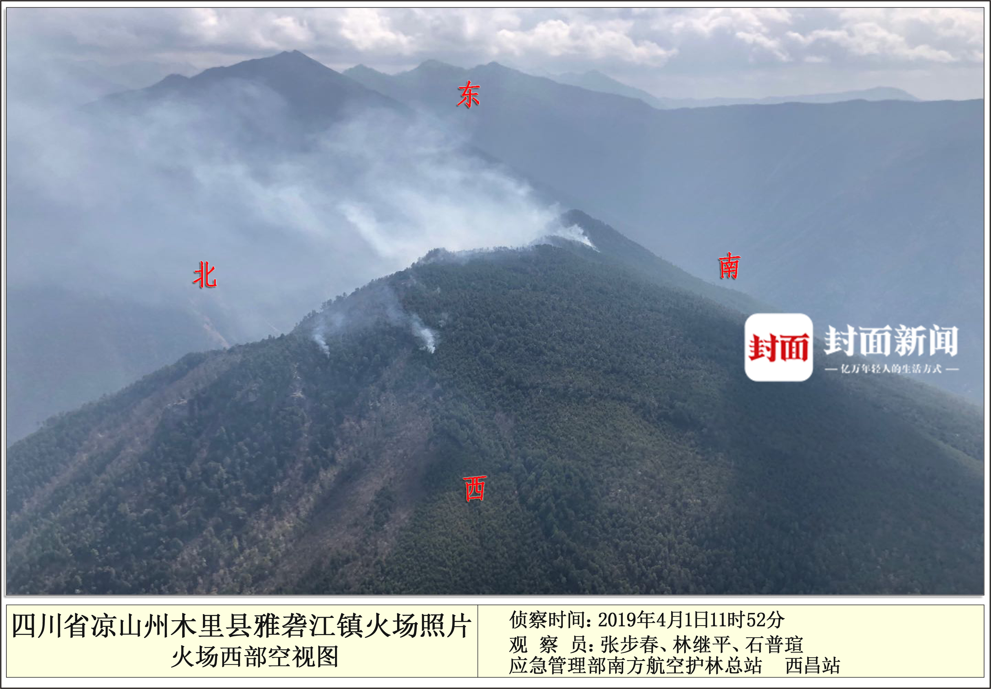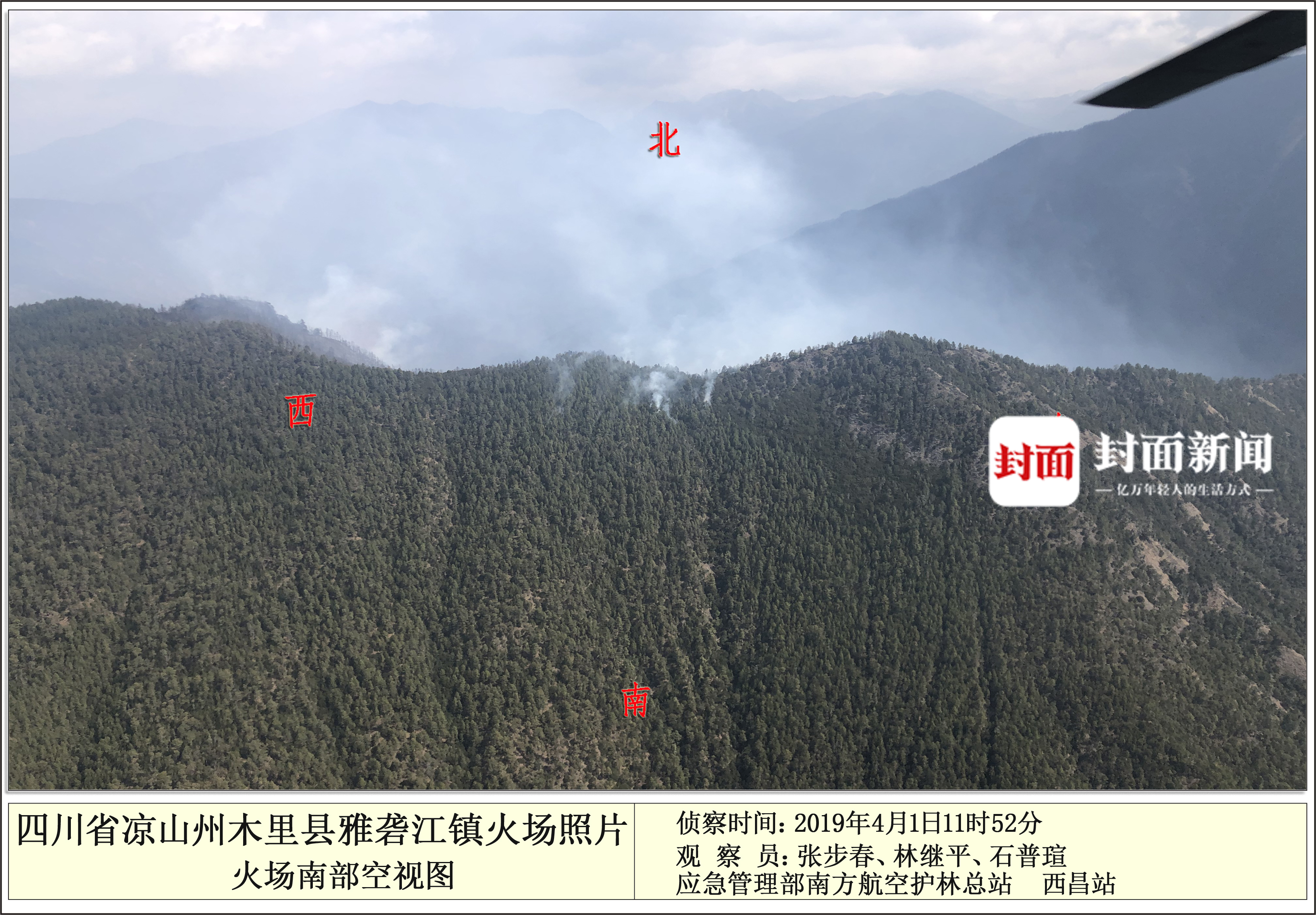 4月1日11时52分火场情况:火场最高海拔约3700米,火场地形陡峭,火场四周松、杉混交林,林相好(很多地方无法看见地面情况)。火场火情主要分布于火场东北、西北、西部和南部。火场东北部有一火头,火势强,向东北发展,已快到山沟;火场西北有一火头,火势强,向西北发展;火场南部(山脊处)有一火头,火势强,向南发展;火场西部有一火点,火势中,向西发展,火场南风5米/秒。