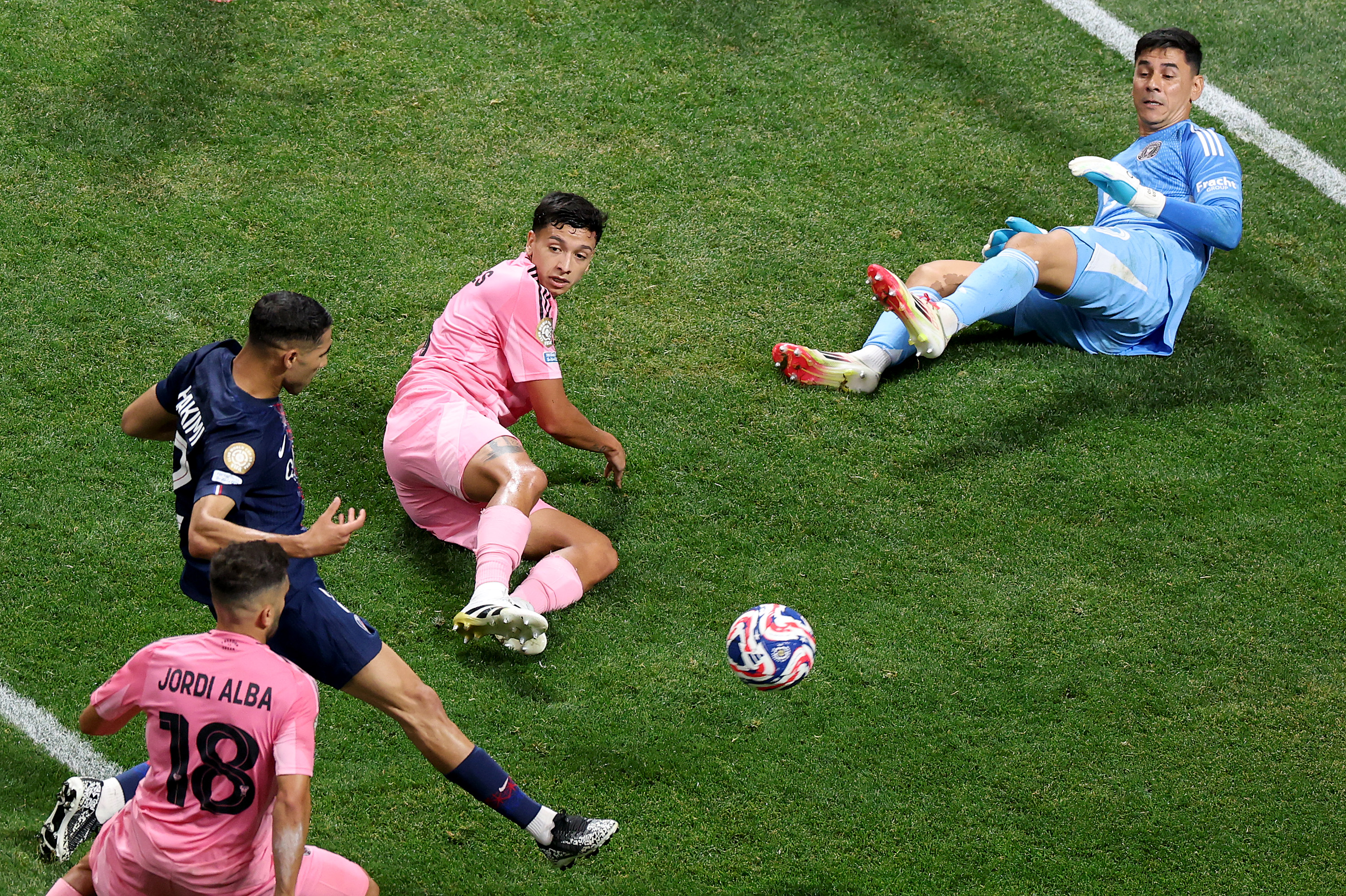 开场后,“大巴黎”彻底压制对手,前12分钟的控球率高达86%。第6分钟,维蒂尼亚开出任意球,无人防守的内维斯后点头球冲顶破门,1:0,“大巴黎”取得梦幻开局。第39分钟,布斯克茨传球失误,法比安禁区右侧横传门前,内维斯打空门完成“双响”。第44分钟,杜埃右路传中打在阿维莱斯身上折射入网,造成乌龙球,“大巴黎”三球领先。上半场补时阶段,阿什拉夫补射破门,4:0。整个上半场,“大巴黎”10次射门6次射正,迈阿密国际无一脚射门。