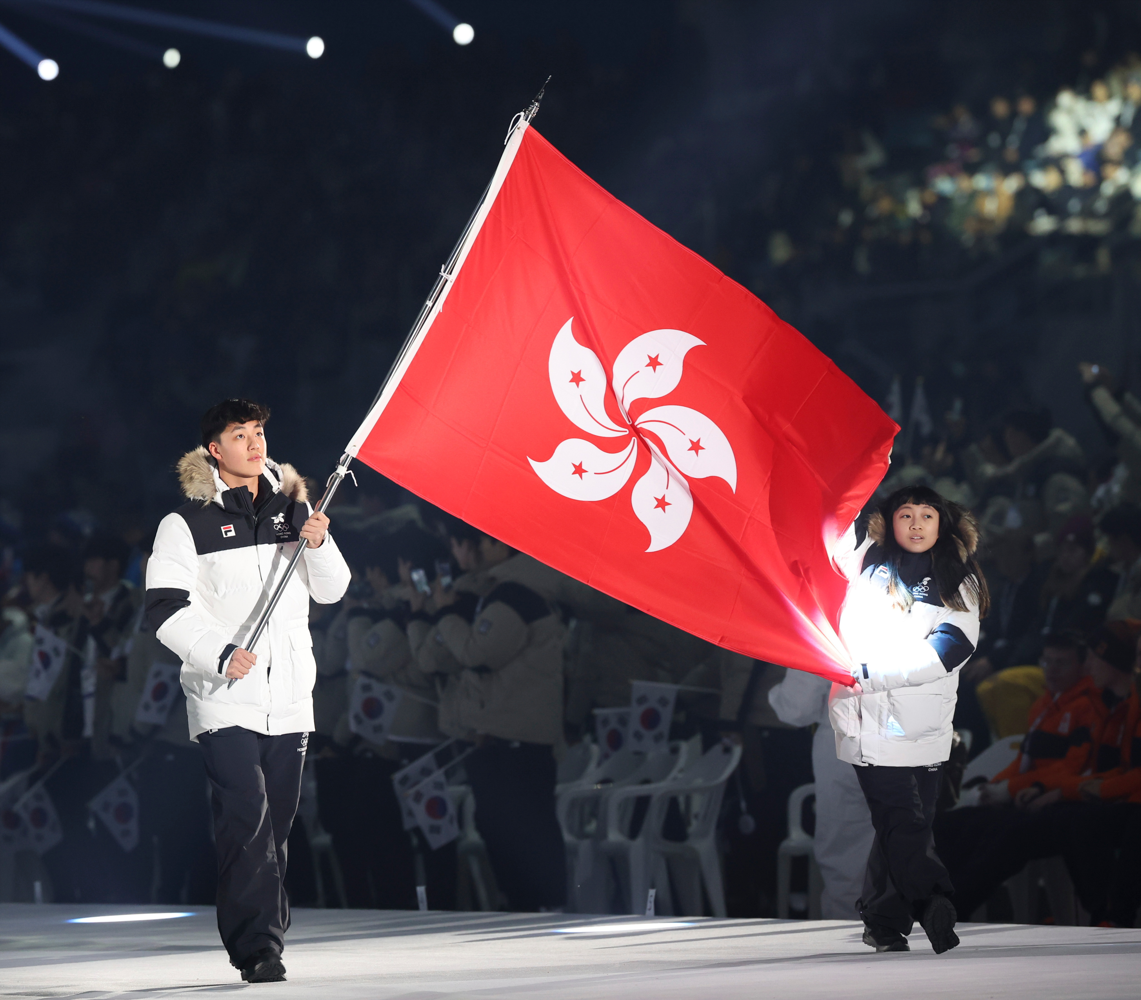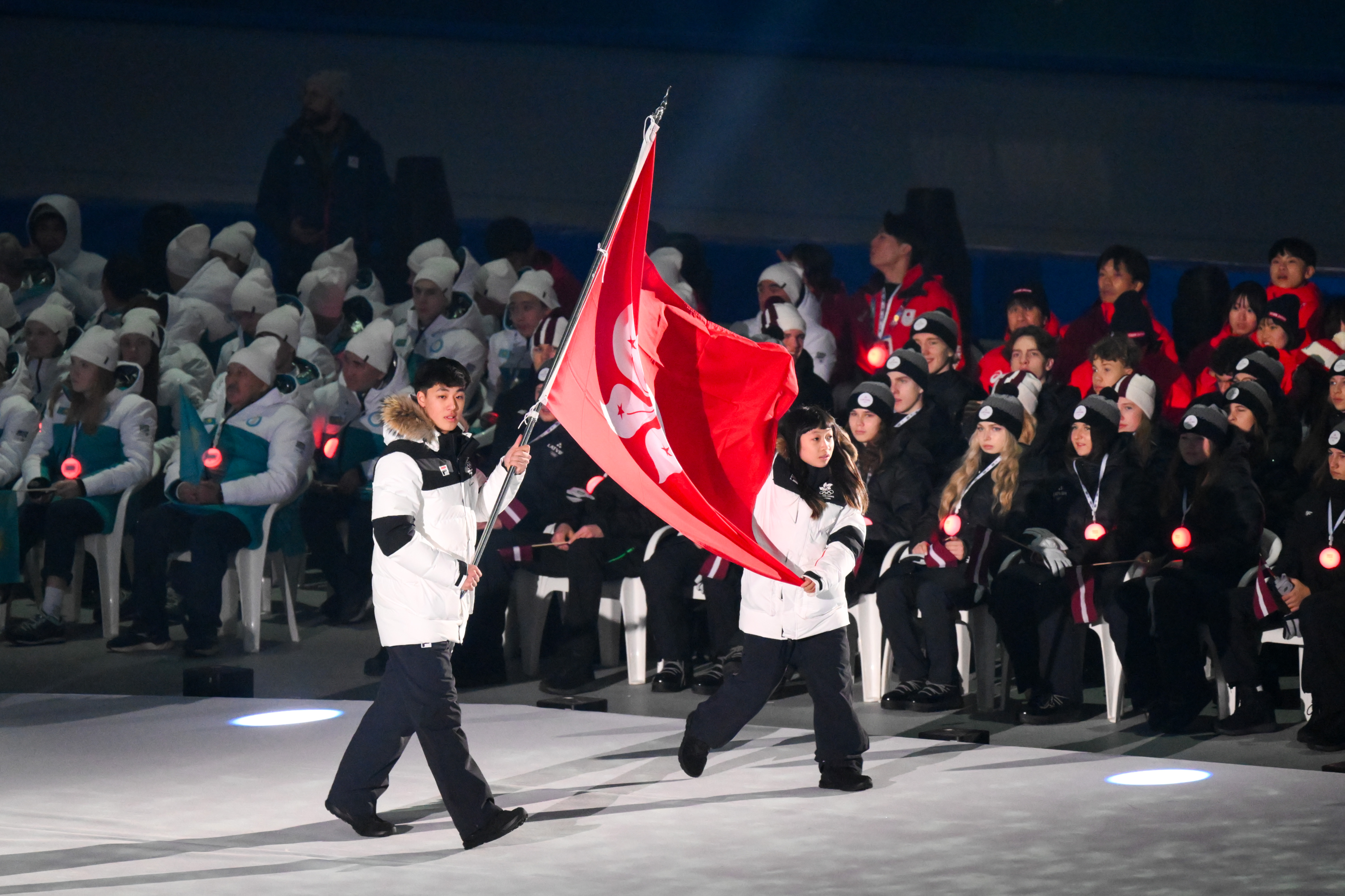 1月19日,中国香港代表团旗手王智颢(左)和陈倩凝在江陵速滑馆举行的开幕式上入场。新华社记者 姚琪琳 摄