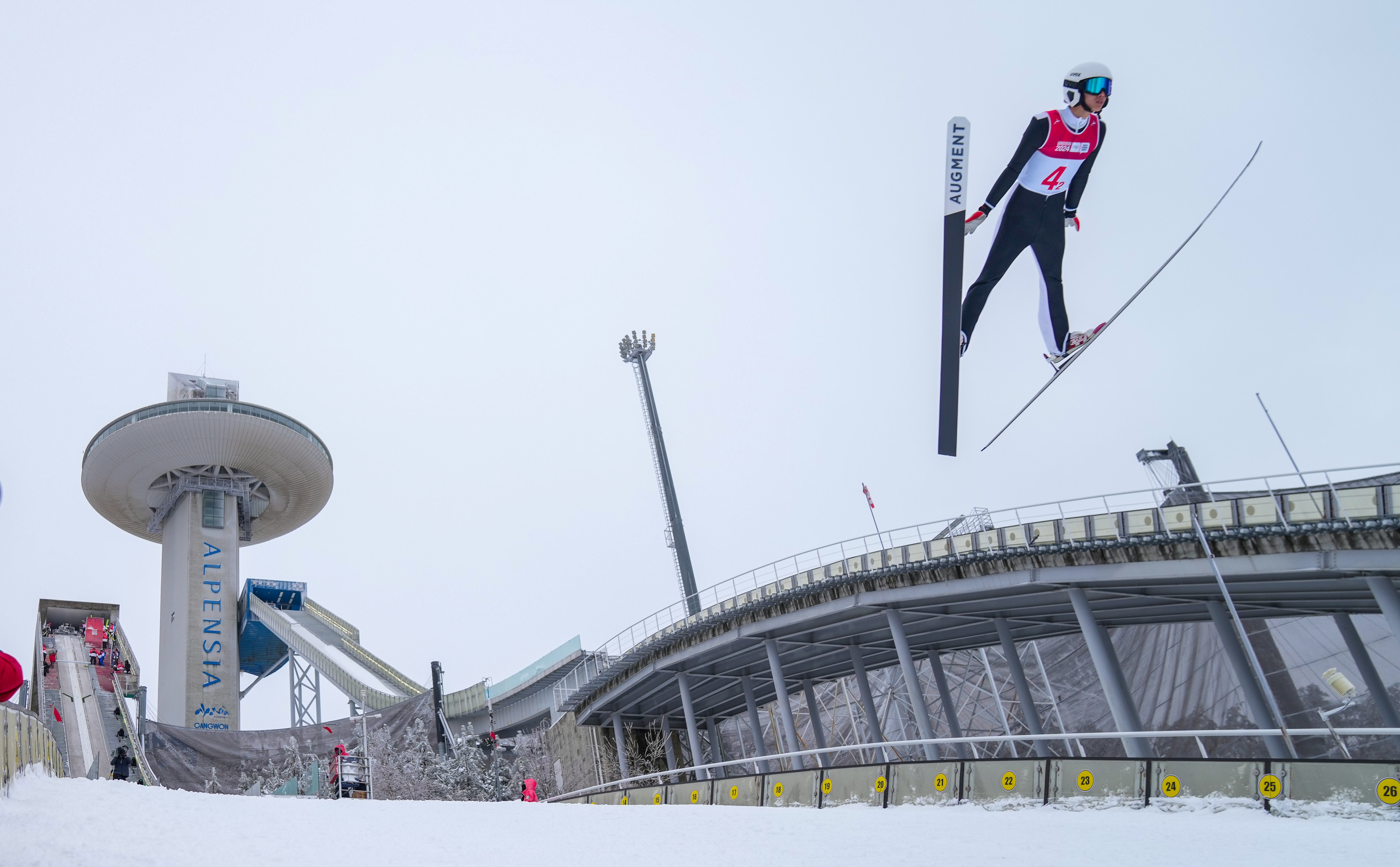 1月21日,任浩然在比赛中。当日,在韩国平昌进行的2024年江原道冬青奥会跳台滑雪混合团体赛决赛中,中国队组合任浩然、郑鹏博、翁杨宁和唐嘉鸿以543.2分的成绩获得第十二名。新华社记者 张笑宇 摄