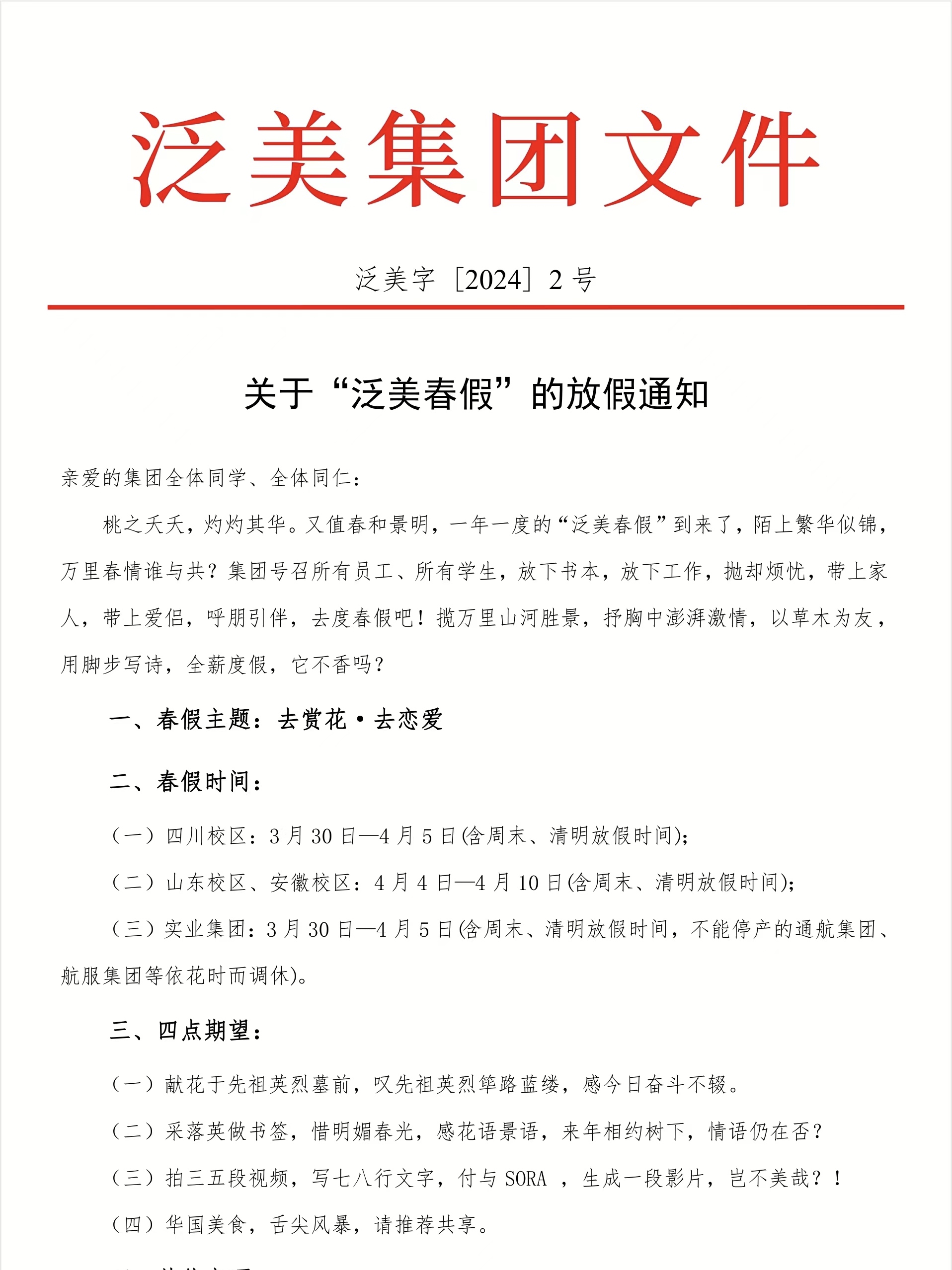 值得一提的是,这是学校实行例行春假制度的第三年,希望通过此举让老师们带薪休假,让同学们走出课堂、走出校园,去接触大自然,用心感受春天和爱情的美好。