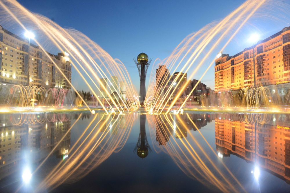 这是2017年6月11日拍摄的哈萨克斯坦首都阿斯塔纳的巴伊杰列克观景塔夜景。新华社记者沙达提摄