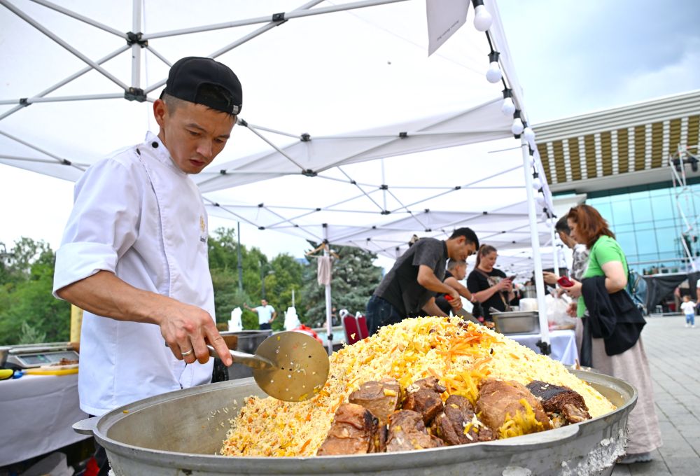 2024年8月24日,在哈萨克斯坦阿拉木图美食节上,厨师制作手抓饭。新华社发(阿拉木图市旅游局供图)