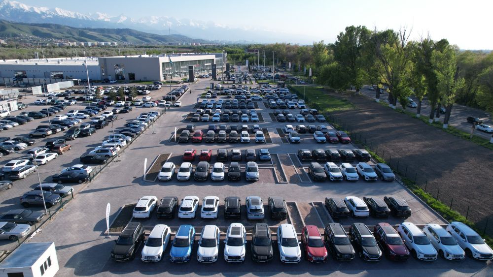 2023年5月5日,汽车停放在哈萨克斯坦阿拉木图一家大型二手车交易市场(无人机照片)。新华社发(奥斯帕诺夫摄)