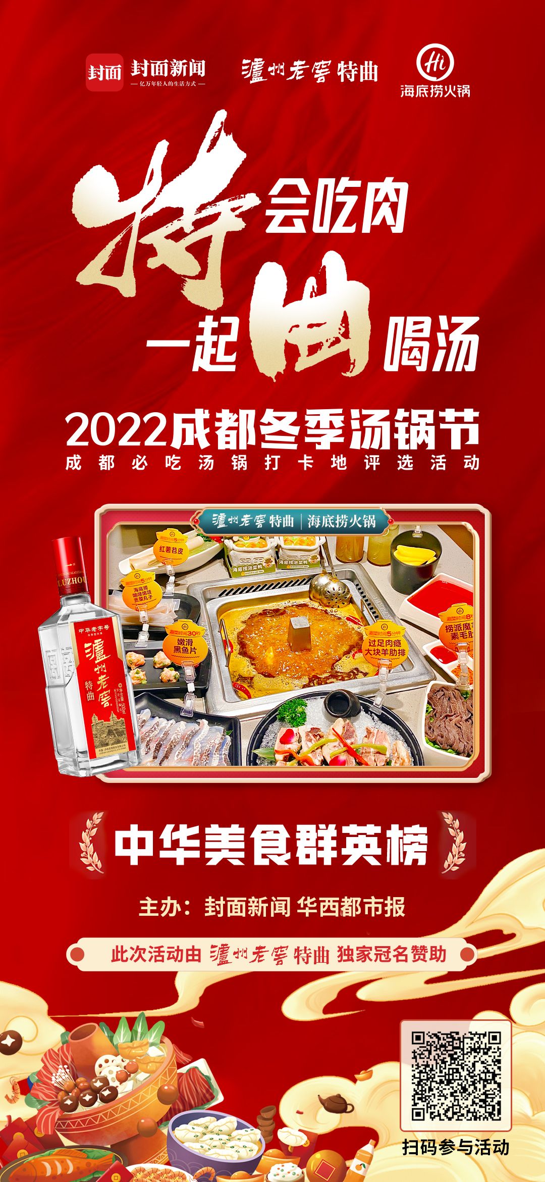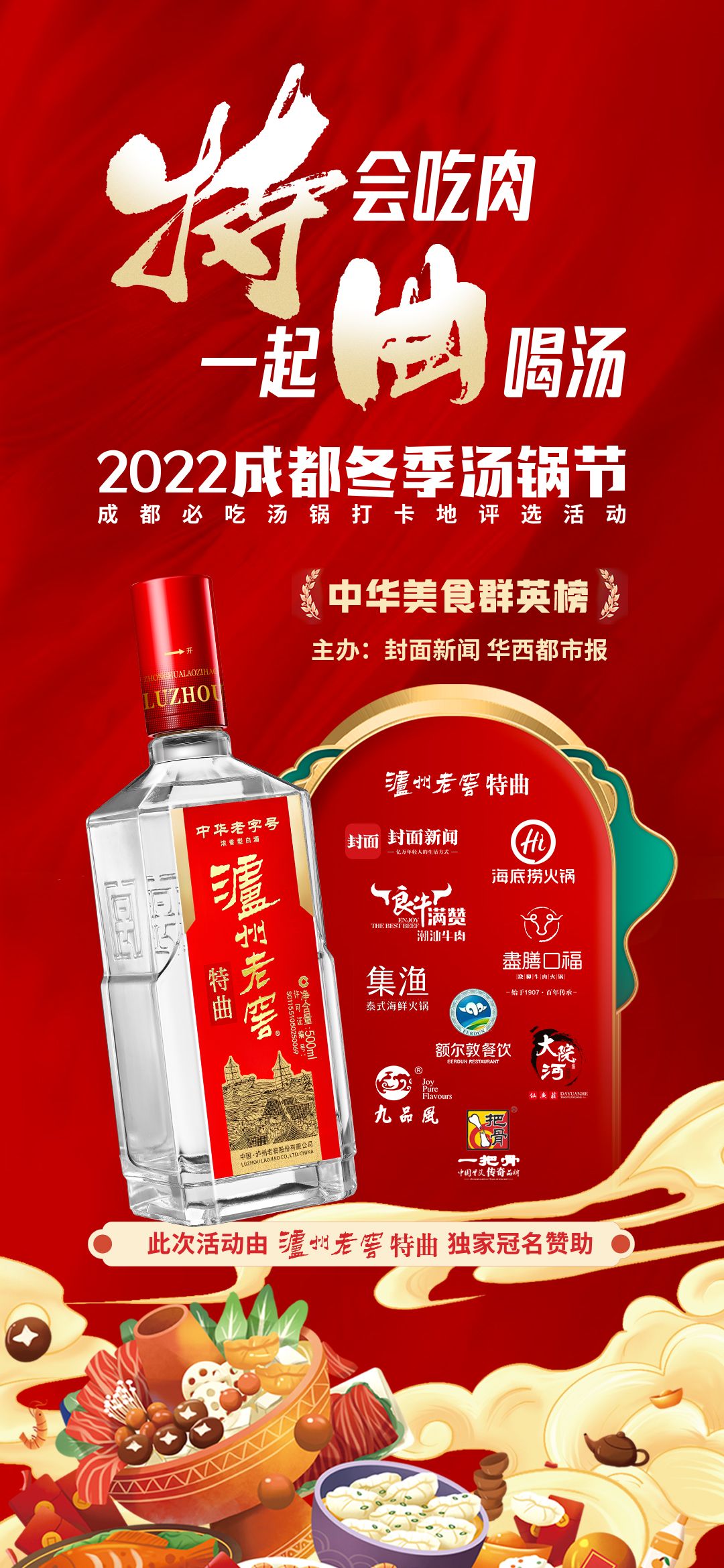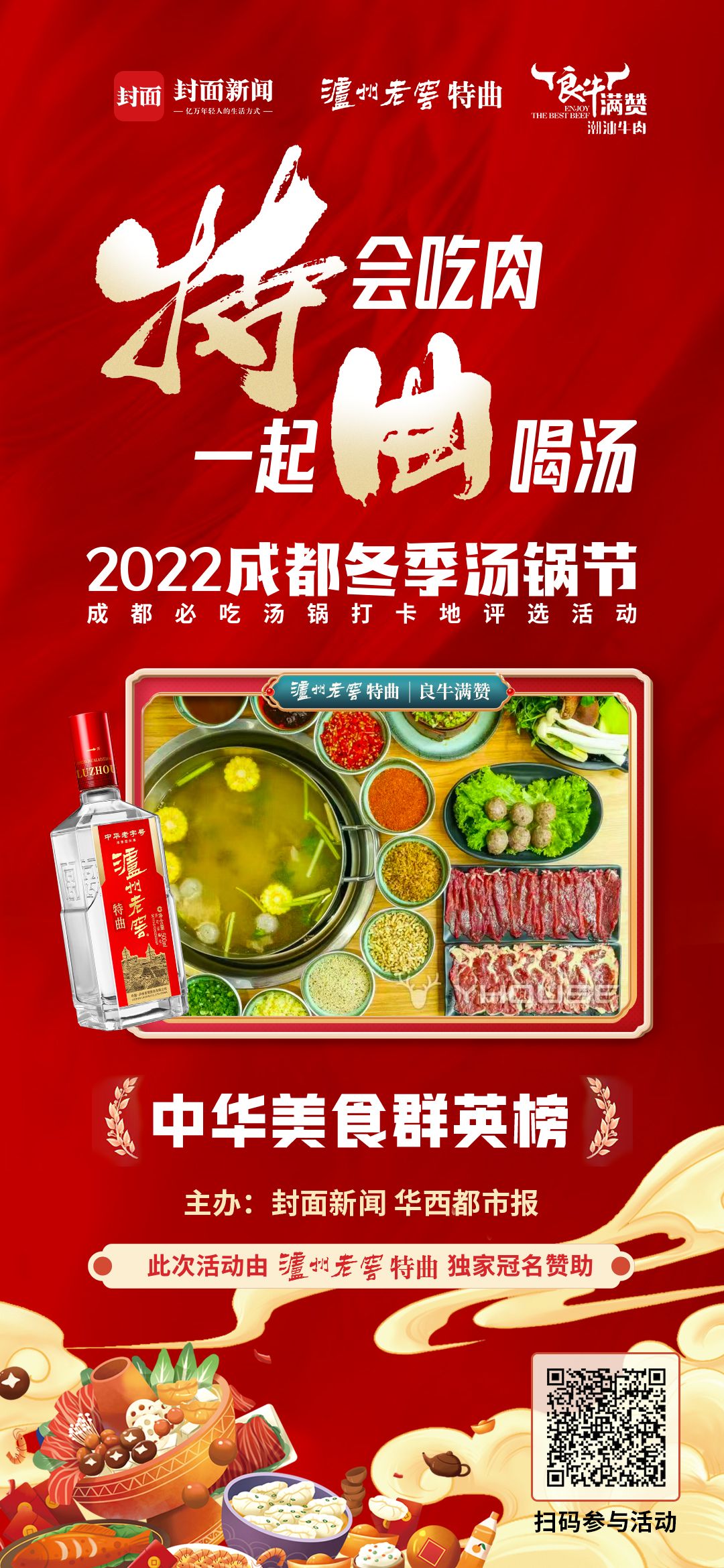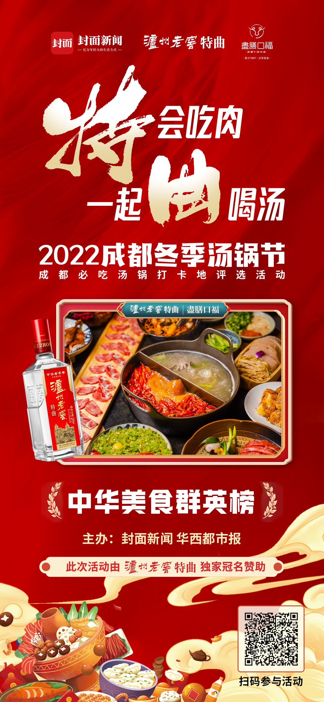 由泸州老窖特曲独家冠名赞助,封面新闻、华西都市报主办的2022成都冬季汤锅节暨成都必吃汤锅打卡地评选活 动已经火爆开启,成都各大汤锅品牌纷纷参与其中,并推出了各种优惠活动,欢迎市民前往打卡。